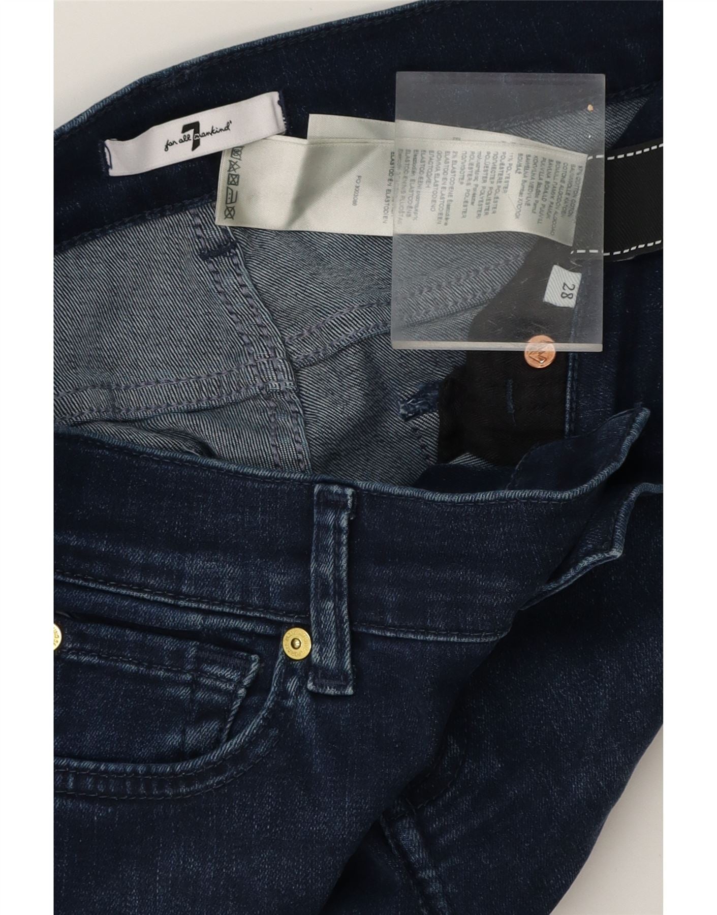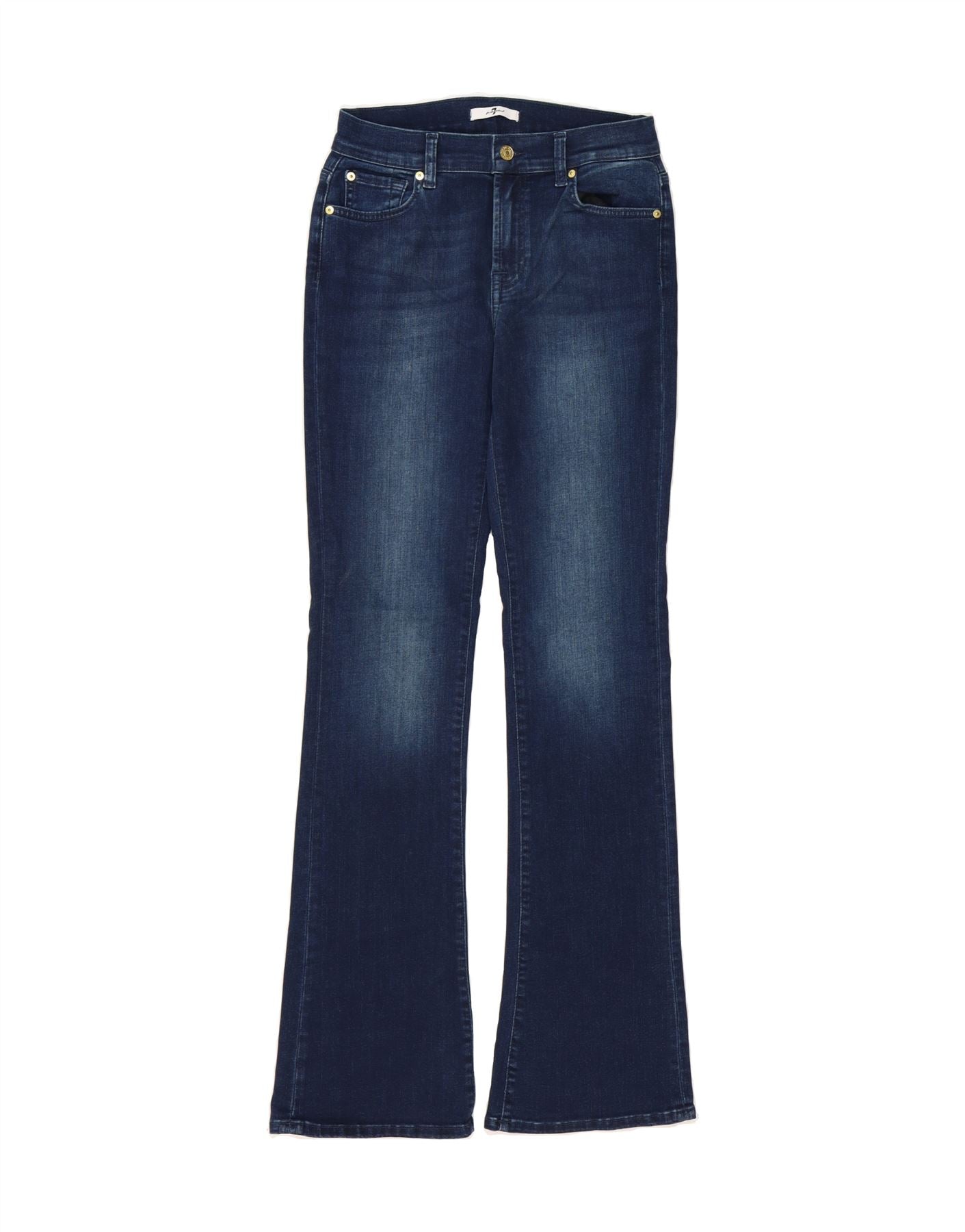 - AI Description: These pre-owned 7 For All Mankind bootcut jeans offer a classic style in blue denim. Crafted from a blend of 43% cotton, 28% rayon, 27% polyester, and 2% elastane for a comfortable regular fit. Features include a button closure and practical pockets. While in excellent condition, there are minor discolorations on the front and back, and visible wear on the waistband. Machine washable. Size 28.