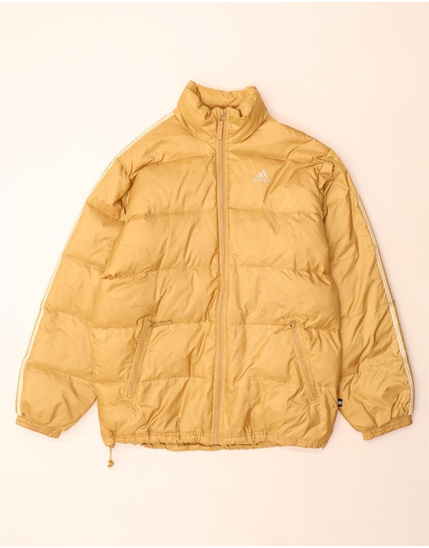 - Descripción de IA: Esta chaqueta acolchada para hombre Adidas viene en una llamativa tela mezclada en dorado, que ofrece una sensación de acolchado y aislamiento. Cuenta con cuello alto y cierre de cremallera completa para mayor calidez. Las mangas largas y el corte regular garantizan comodidad. El diseño incluye prácticos bolsillos y el icónico logo de Adidas. Las rayas blancas adornan las mangas, añadiendo un toque deportivo clásico.