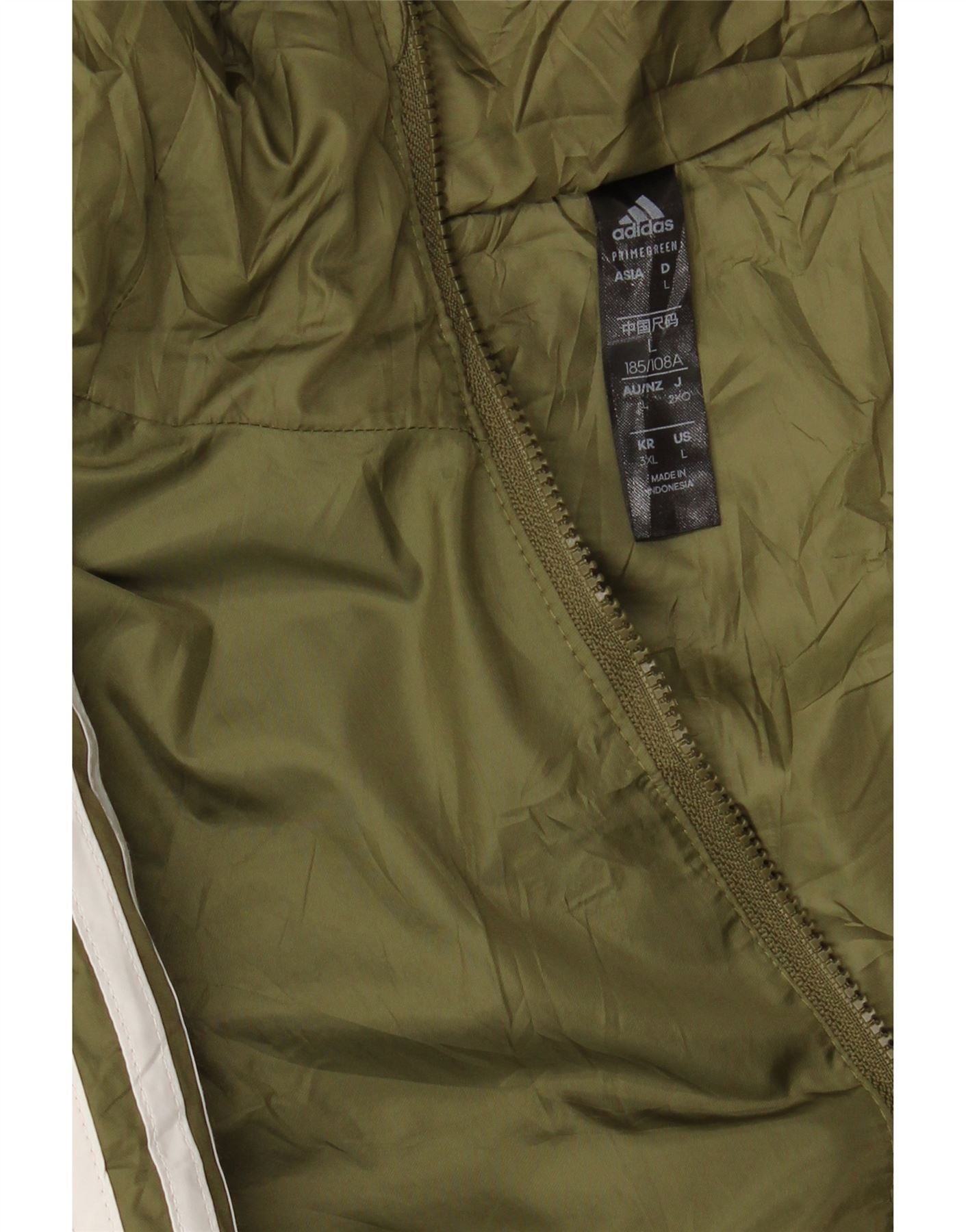 - AI Description: This pre-owned Adidas padded jacket in green is perfect for sports or casual wear. Crafted from woven polyester with a regular fit, it features a zip closure, long sleeves, and a hooded design. Accented with the Adidas logo, this jacket includes zipped pockets for added convenience. A stylish and practical choice in excellent condition. Label size L.