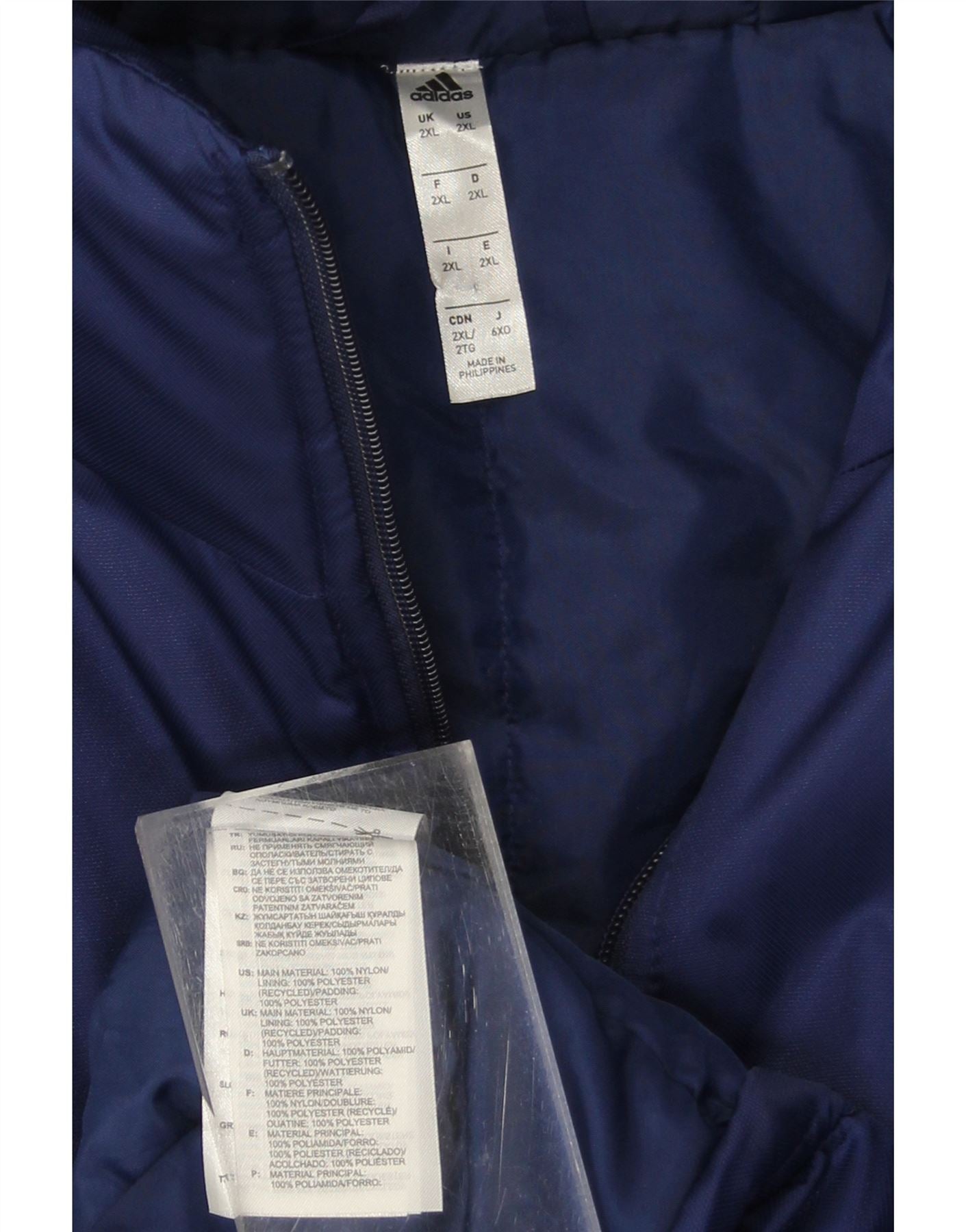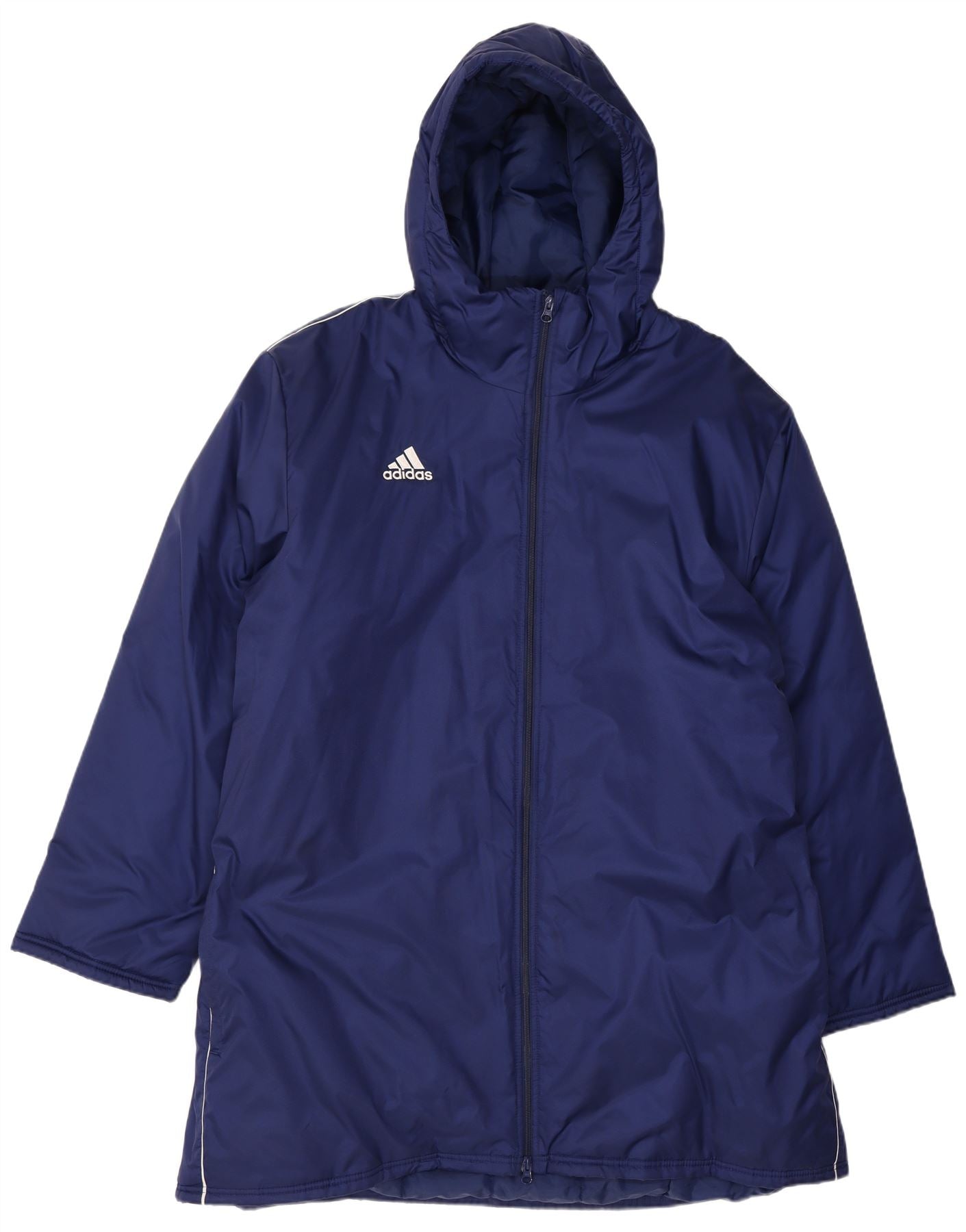 - AI Description: This Adidas mens padded coat is crafted from durable navy blue nylon. Its woven outer shell provides a smooth finish. The padded design offers warmth and a comfortable regular fit. It features a practical zip closure and a protective hood. Long sleeves ensure full coverage. A subtle logo accent completes this functional sports style.