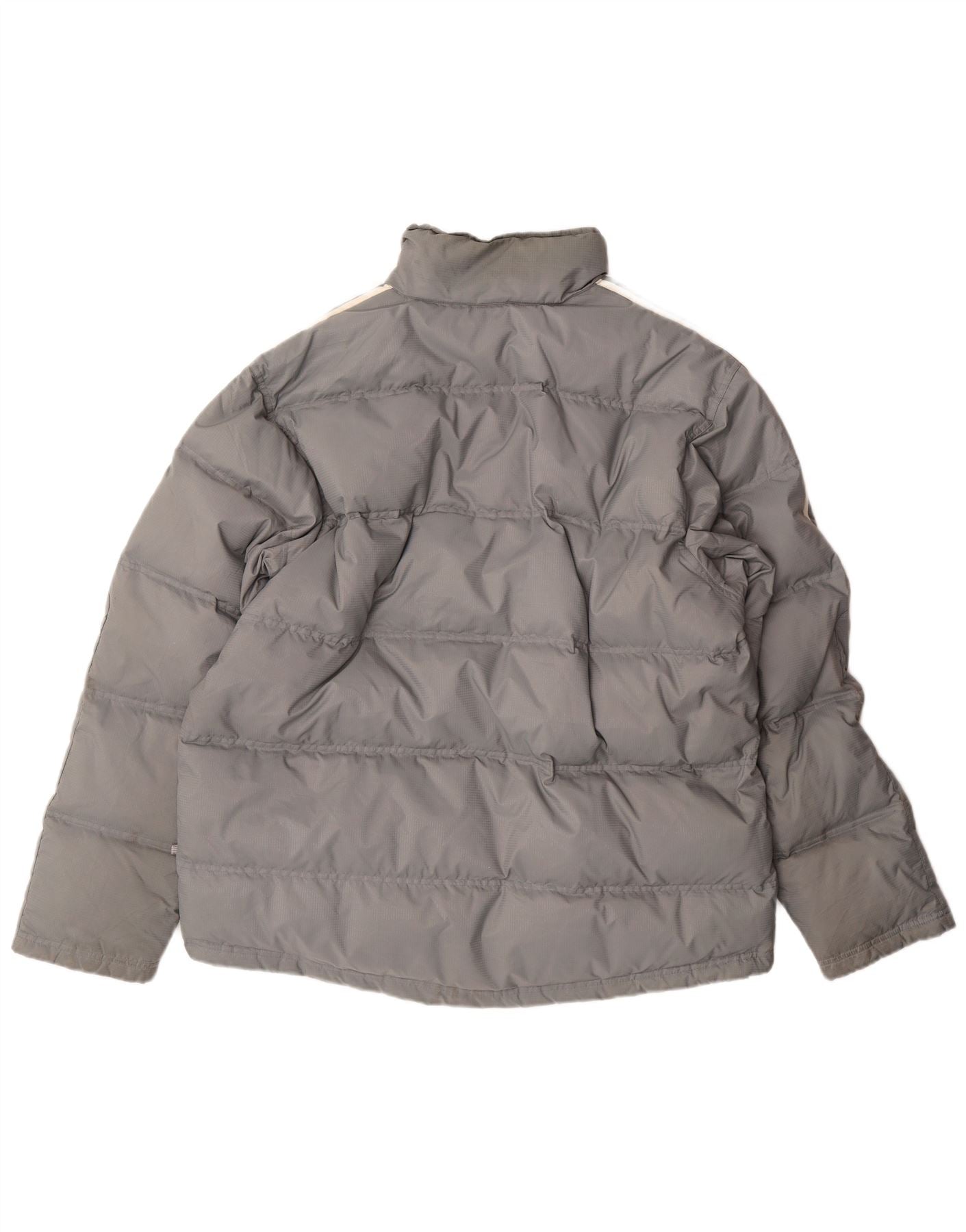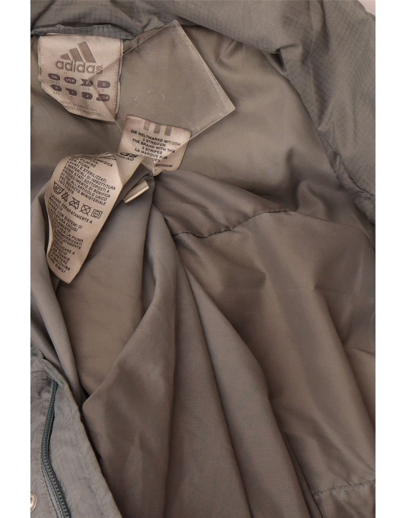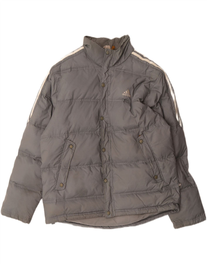 - AI Description: This Adidas mens padded jacket is crafted from durable grey nylon with a thermal down filling. It features a collared neckline and a full zip closure for practical wear. Long sleeves and a regular fit offer comfortable coverage. Multiple pockets provide useful storage. The jacket is windproof, making it ideal for outdoor activities, and finished with a subtle logo accent.