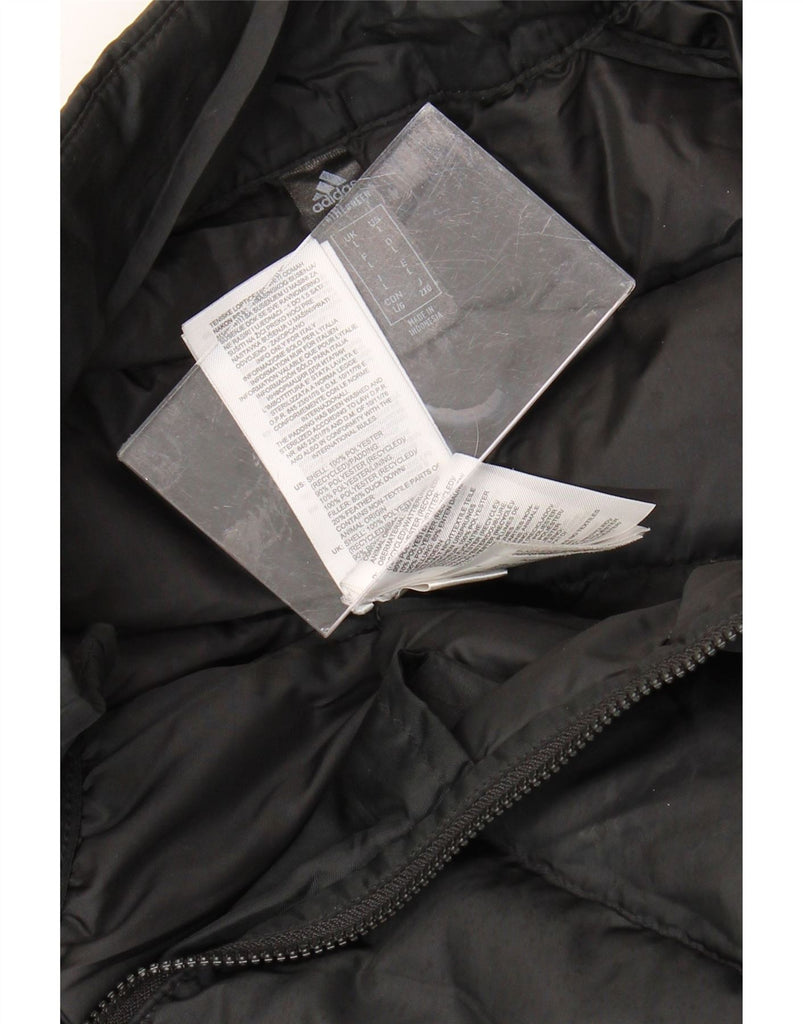 - AI Description: This Adidas mens padded jacket is crafted from black polyester with a smooth finish. It features a lightweight down and feather filling for thermal warmth. The collared neckline and long sleeves offer classic coverage. A full zip closure secures the front. Its regular fit ensures comfortable wear. Practical pockets provide storage. A subtle logo accent completes the sporty design.