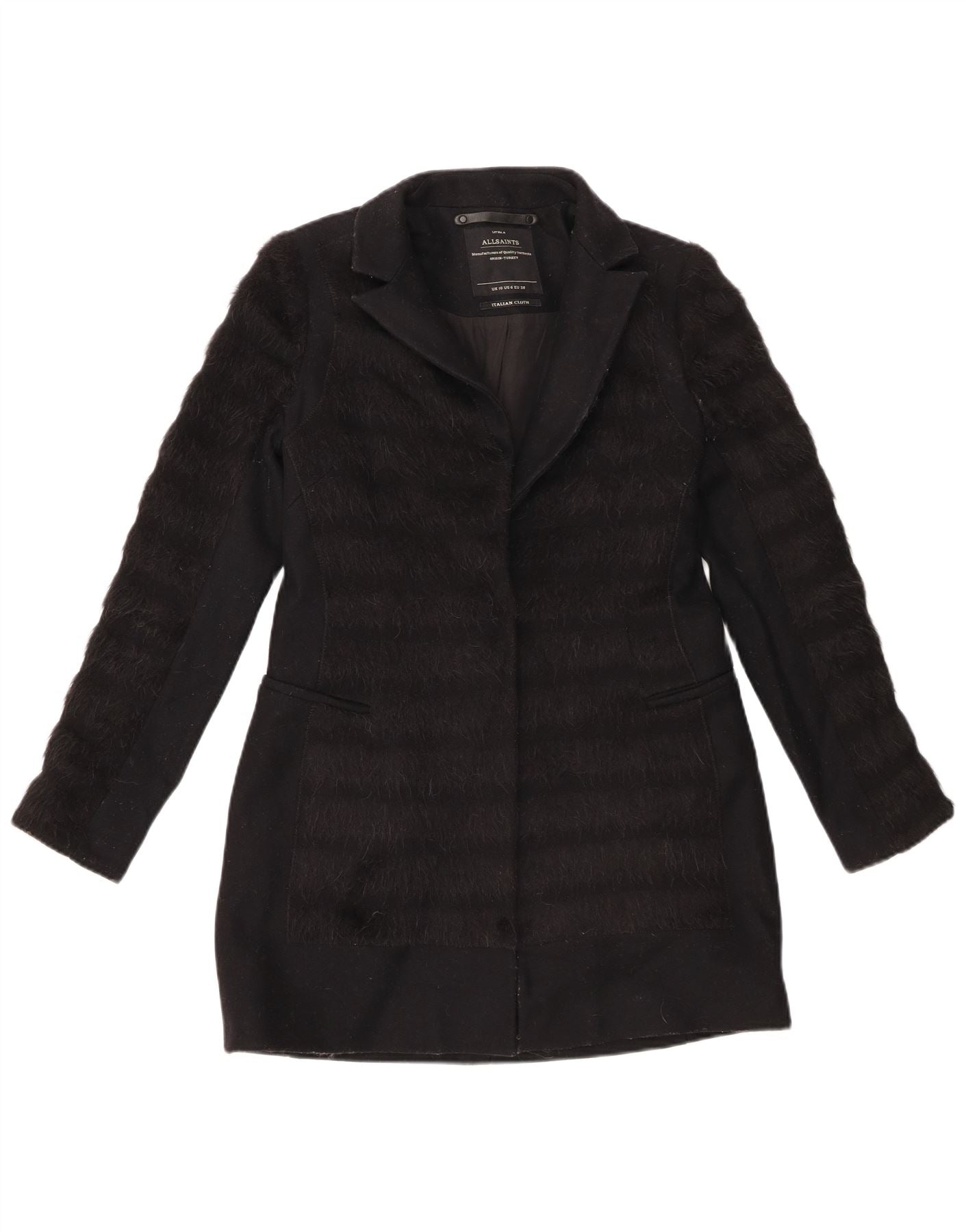 - Descripción de IA: Este abrigo de piel para mujer de All Saints está confeccionado con una lujosa mezcla de lana virgen negra y presenta paneles distintivos con textura de piel. Presenta un escote de cuello clásico y manga larga. El corte regular ofrece una silueta sofisticada. Un cierre de botón proporciona un acabado impecable. En el diseño están integrados prácticos bolsillos. Este abrigo forrado combina calidez con un estilo elegante.
