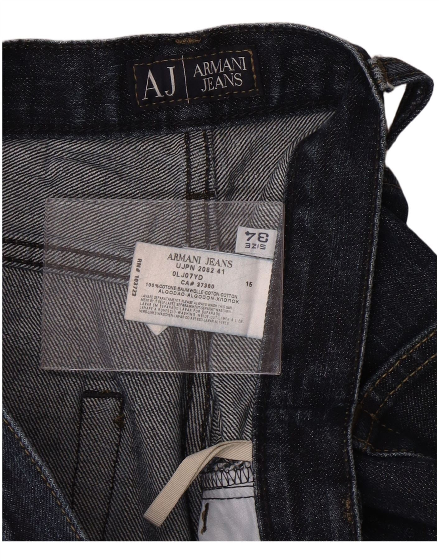 - AI Description: These Armani Jeans men's straight jeans are crafted from 100 percent cotton denim in a rich navy blue. They feature a classic straight leg and a regular fit for comfort. The button closure ensures a secure wear. Practical pockets are included, and a subtle logo accent adds brand recognition. This classic fit offers timeless style and versatility.