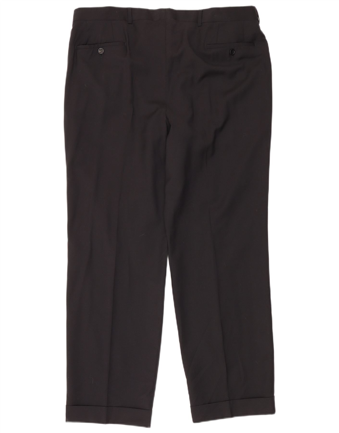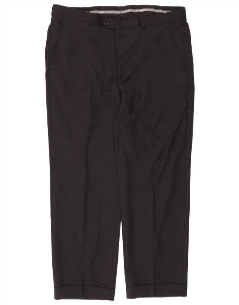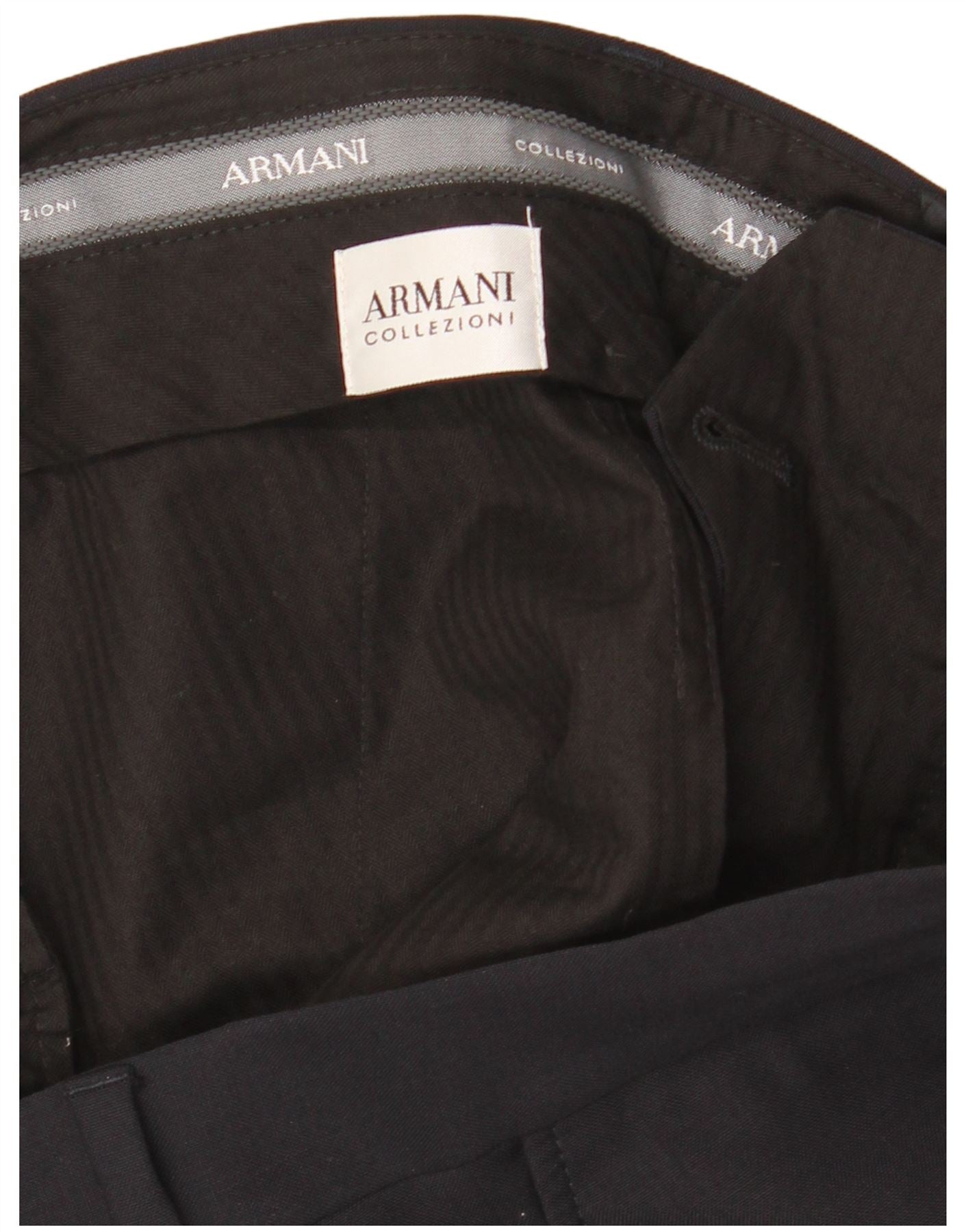 - AI Description: These Armani men's suit trousers are crafted from a premium black woven fabric. They feature a regular fit for classic comfort. The button closure and tailored waist ensure a smart silhouette. Cuffed hems add a refined finish. Practical pockets are included for convenience. The design is clean and unpatterned, embodying timeless elegance.