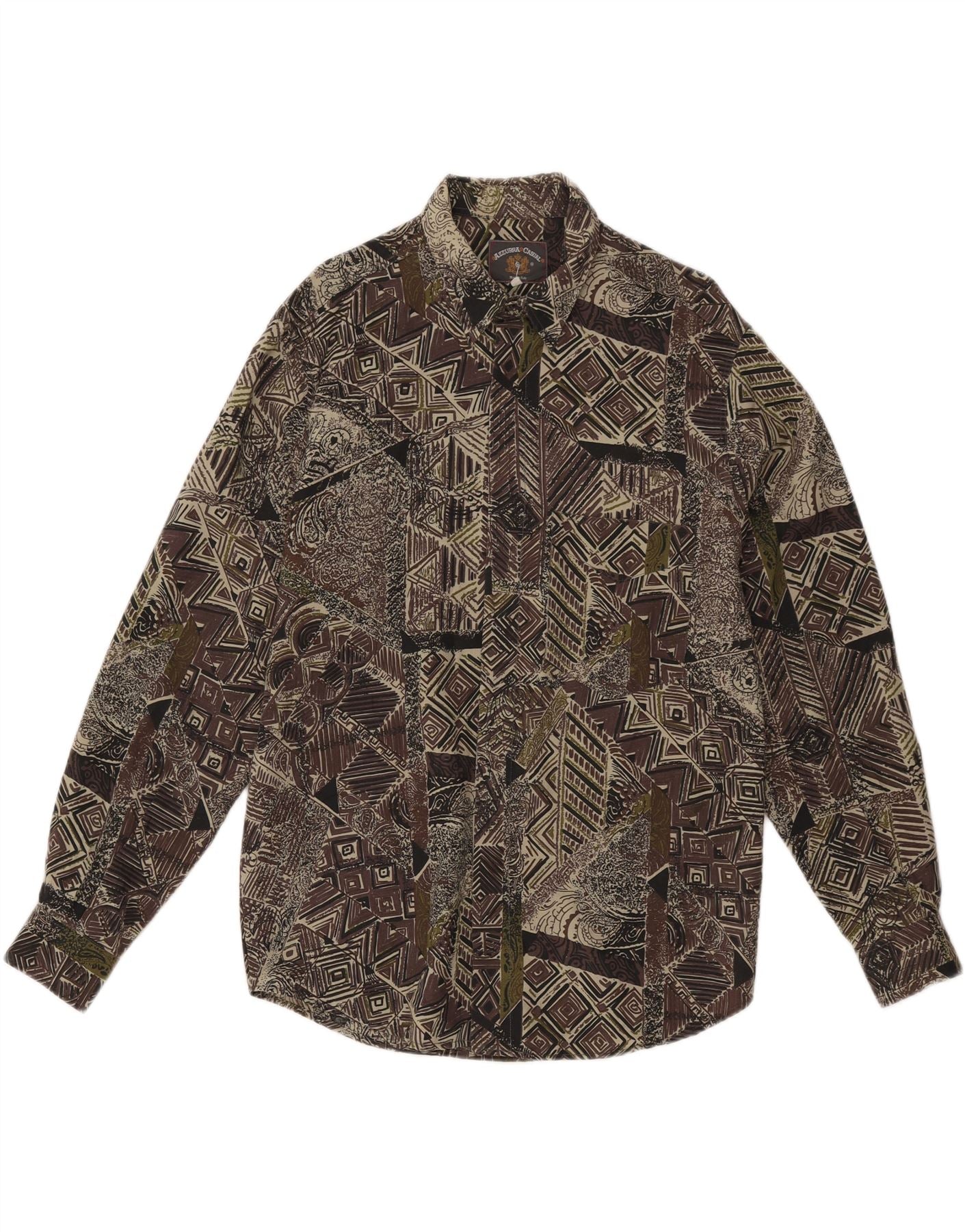 - Descripción de IA: Esta camisa para hombre Azzurra Casual está confeccionada con un tejido que ofrece una textura cómoda. Presenta un llamativo patrón geométrico y abstracto multicolor en tonos de marrón, verde y beige. El escote con cuello y las mangas largas crean una silueta clásica. Un cierre de botón recorre la parte delantera. Incluye prácticos bolsillos. El corte regular garantiza una gran comodidad. Esta camisa de estilo retro ofrece un look distintivo.