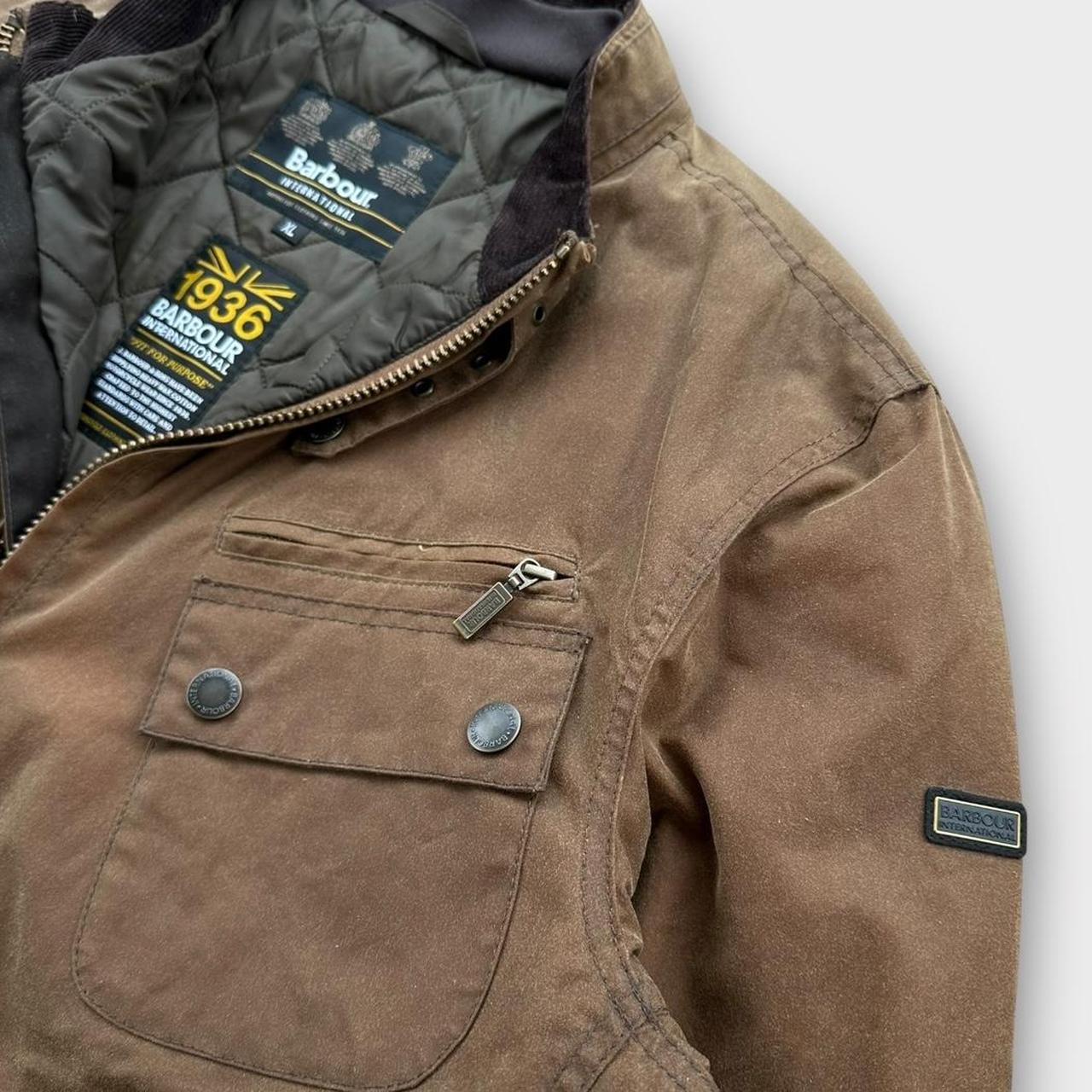Chaqueta encerada clásica acolchada de Barbour International en marrón con múltiples bolsillos y pequeño logo en el brazo