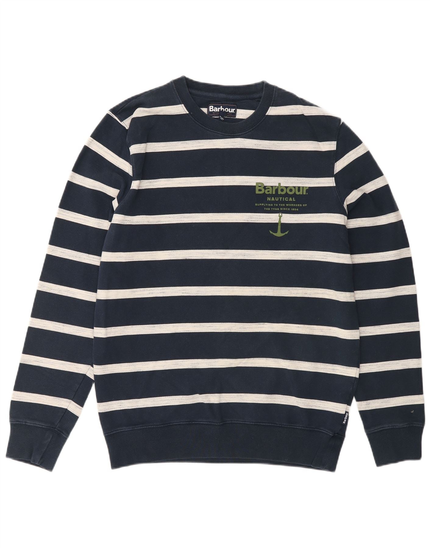 BARBOUR Mens Graphic Sweatshirt Jumper Medium Navy Blue Striped Cotton