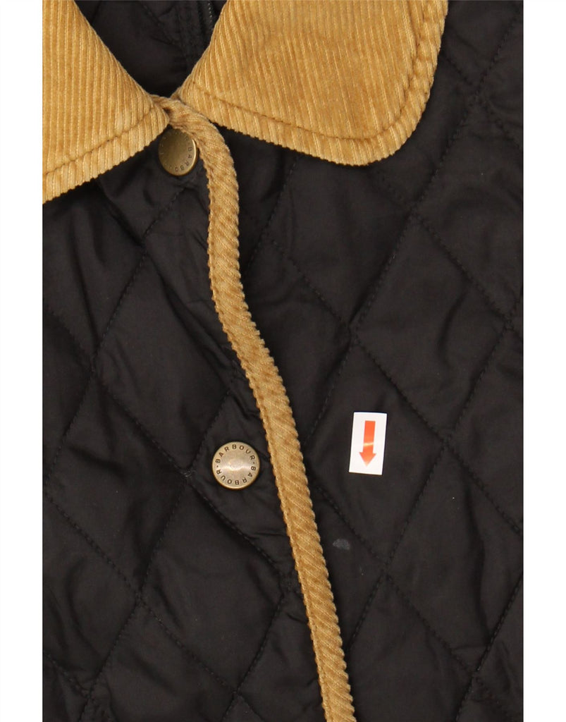 - AI Description: This Barbour womens quilted jacket comes in a classic black finish. It features a woven fabric with corduroy accents, offering a refined texture. The collared neckline and long sleeves provide a traditional silhouette. An argyle diamond pattern adds a sophisticated touch. Button closures and an adjustable waist enhance its classic style. Practical pockets complete the design, ensuring a regular fit for comfortable wear.