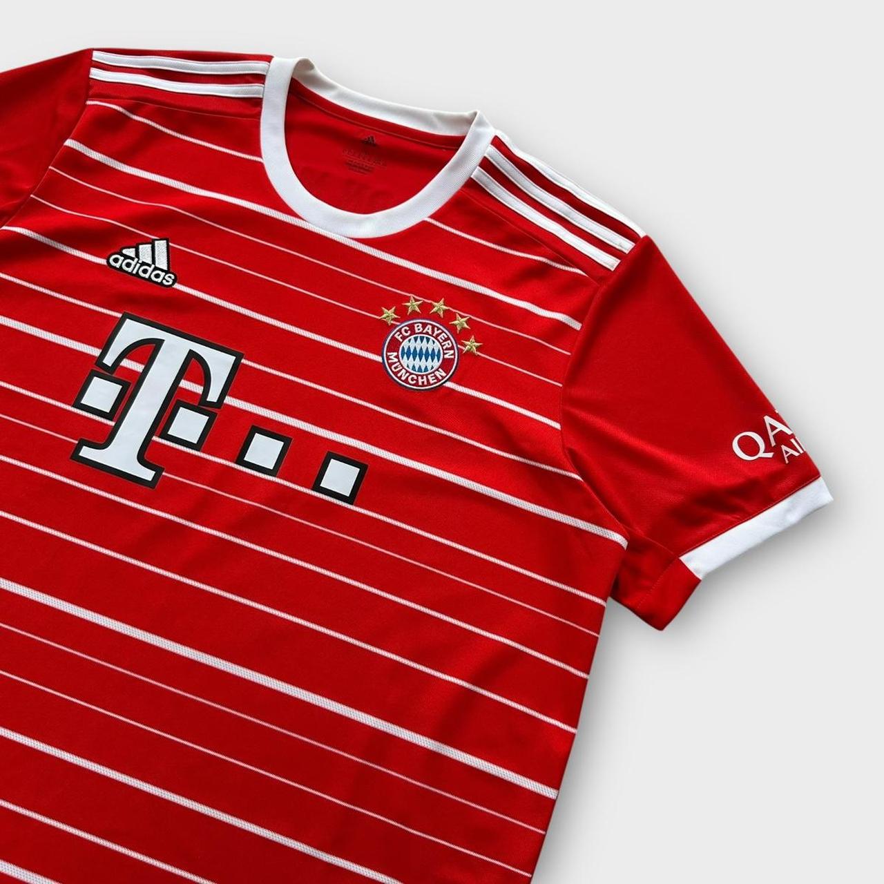 Camiseta de fútbol de primera equipación del Bayern Munich de la temporada 2022/2023 de Adidas con logos bordados y patrocinador T-Mobile en el pecho. Tiene el nombre del jugador "Musiala 42" en la parte posterior.