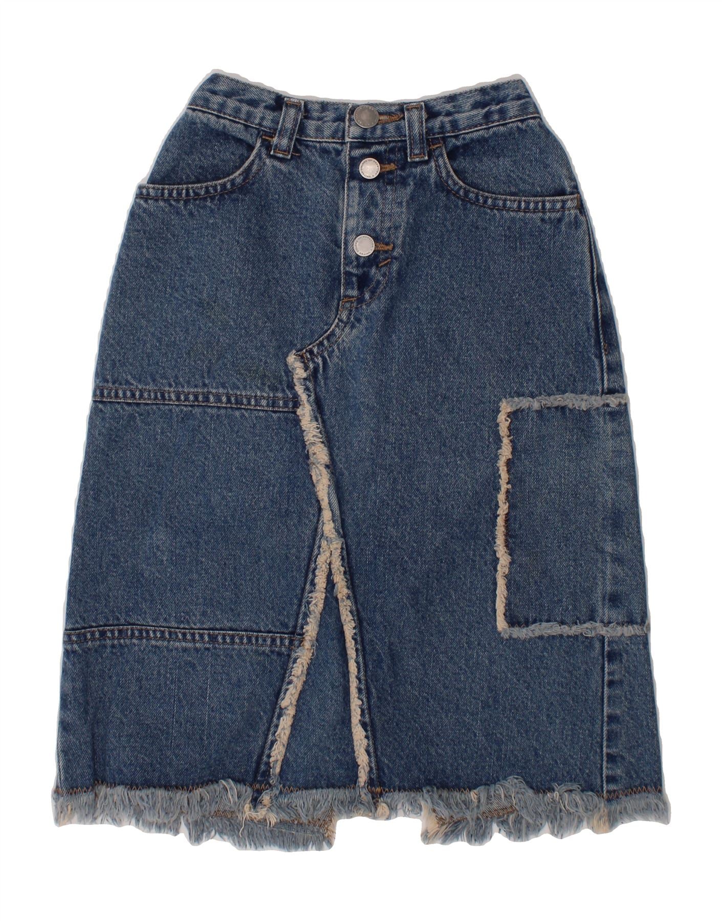 - AI Description: This pre-owned United Colors of Benetton girls' denim skirt features a 90s style with a patchwork pattern. Crafted from cotton denim, this blue skirt has a regular fit, button closure and elastic waist for comfort. It includes pockets and a button accent. The skirt presents a distressed feature with minor visible wear, including frayed edges. A classic and stylish addition to any young girl's wardrobe.