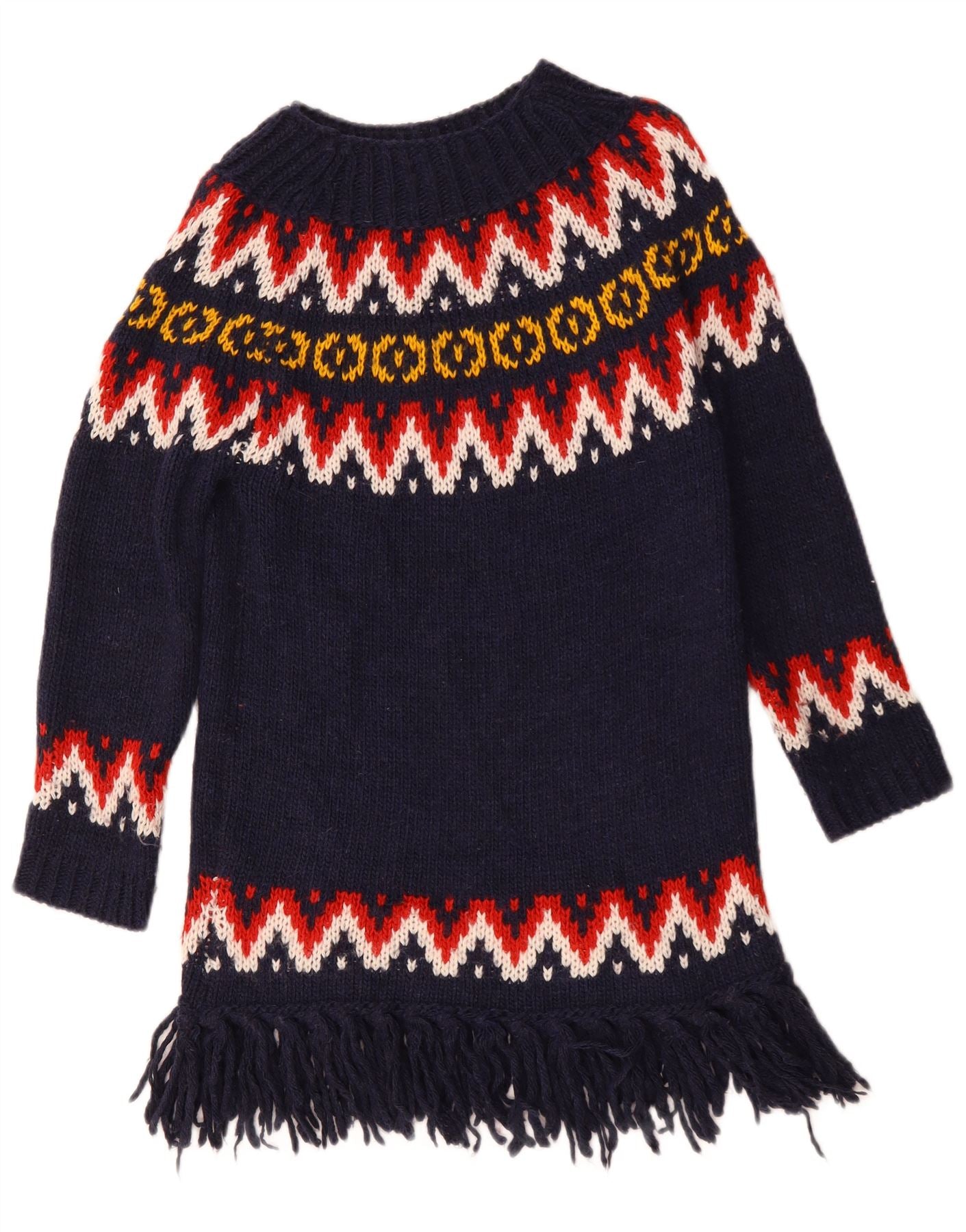 - Descripción de IA: Este jersey para mujer de United Colors Of Benetton está confeccionado con un cómodo punto azul marino. Presenta un llamativo patrón Fair Isle en rojo, blanco y amarillo en el pecho y las mangas. El cuello redondo y las mangas largas ofrecen una silueta tradicional. Un ajuste regular garantiza un uso cómodo. El dobladillo está rematado con un divertido detalle de flecos. Este estilo de jersey combina calidez con una estética clásica y distintiva, perfecta para una apariencia acogedora.