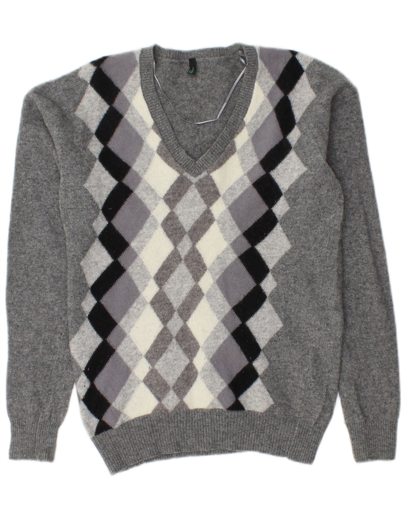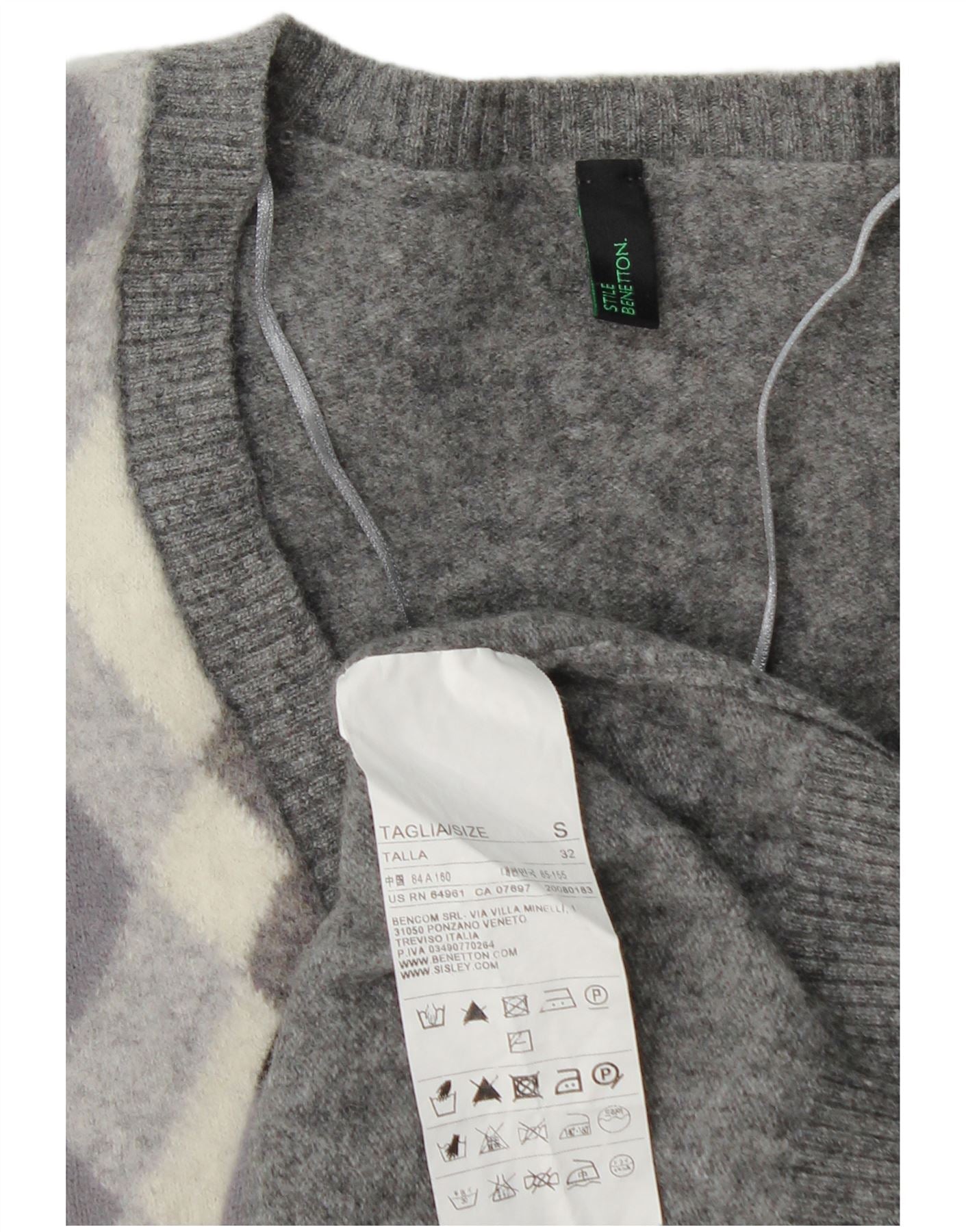 BENETTON Suéter con cuello en V para mujer UK 10 Small Grey Argyle/Diamond Wool