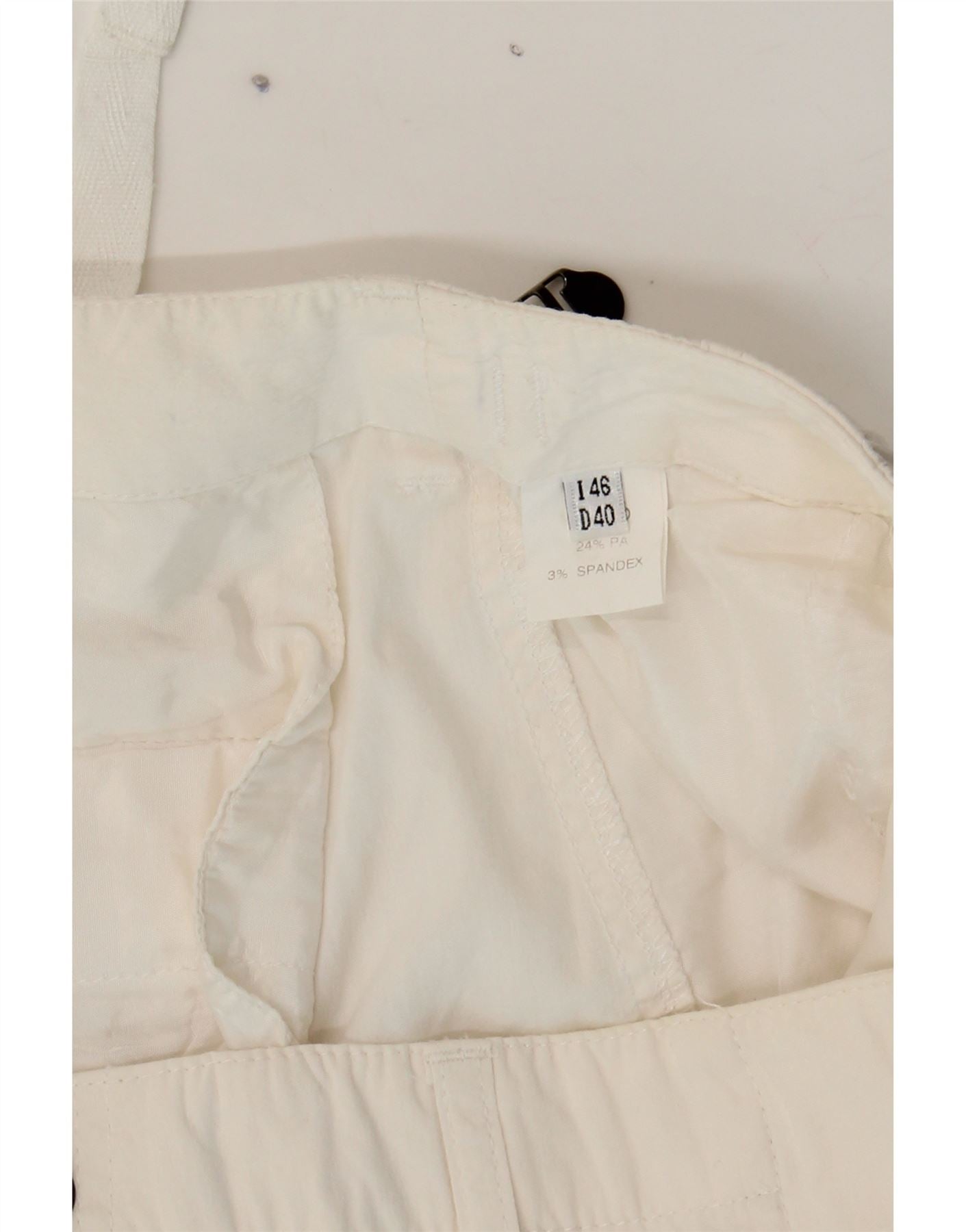 - AI Description: These pre-owned, white cargo trousers from Blugirl Blumarine offer a stylish army-inspired aesthetic. Crafted from a woven fabric with a regular fit, they feature a comfortable drawstring closure and practical pockets. Accented with a button and further detailed with zip and logo embellishments. The trousers are made from a blend of materials, including spandex, polyamide and cotton. Labelled size I 46, D 40.