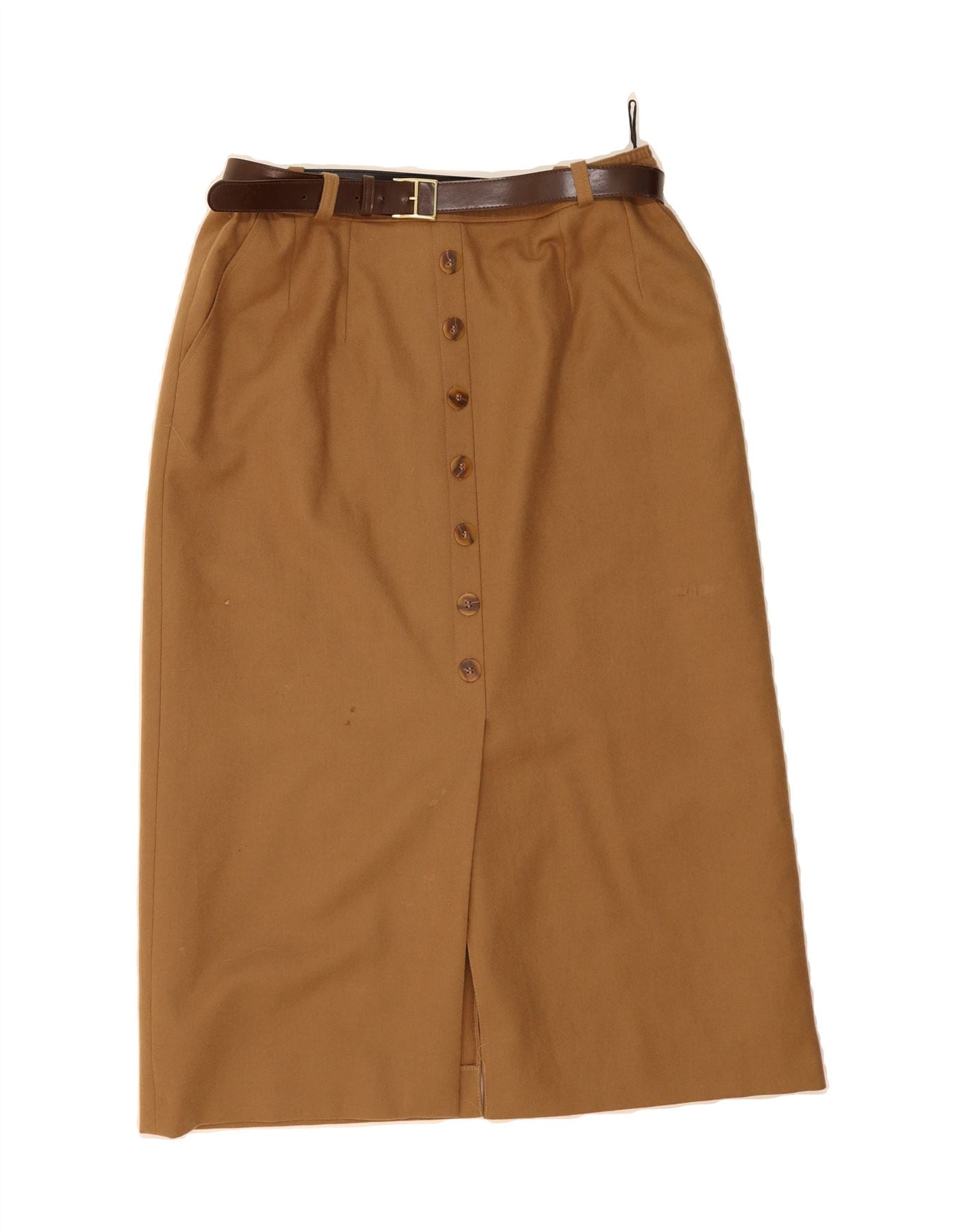 - AI Description: This classic Brendella pencil skirt is crafted from 100% wool in a versatile brown hue. The woven fabric offers a regular fit with a belted waist and button closure. Features include practical pockets and button accents. Pre-owned in good condition, it presents minor stains and discoloration on the front and back, alongside visible wear on the front and discoloration on the label. For care, professional dry cleaning is recommended.
