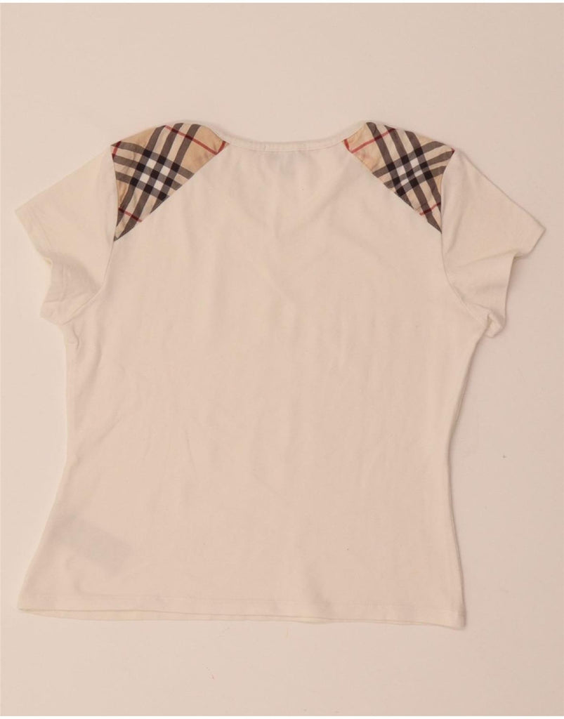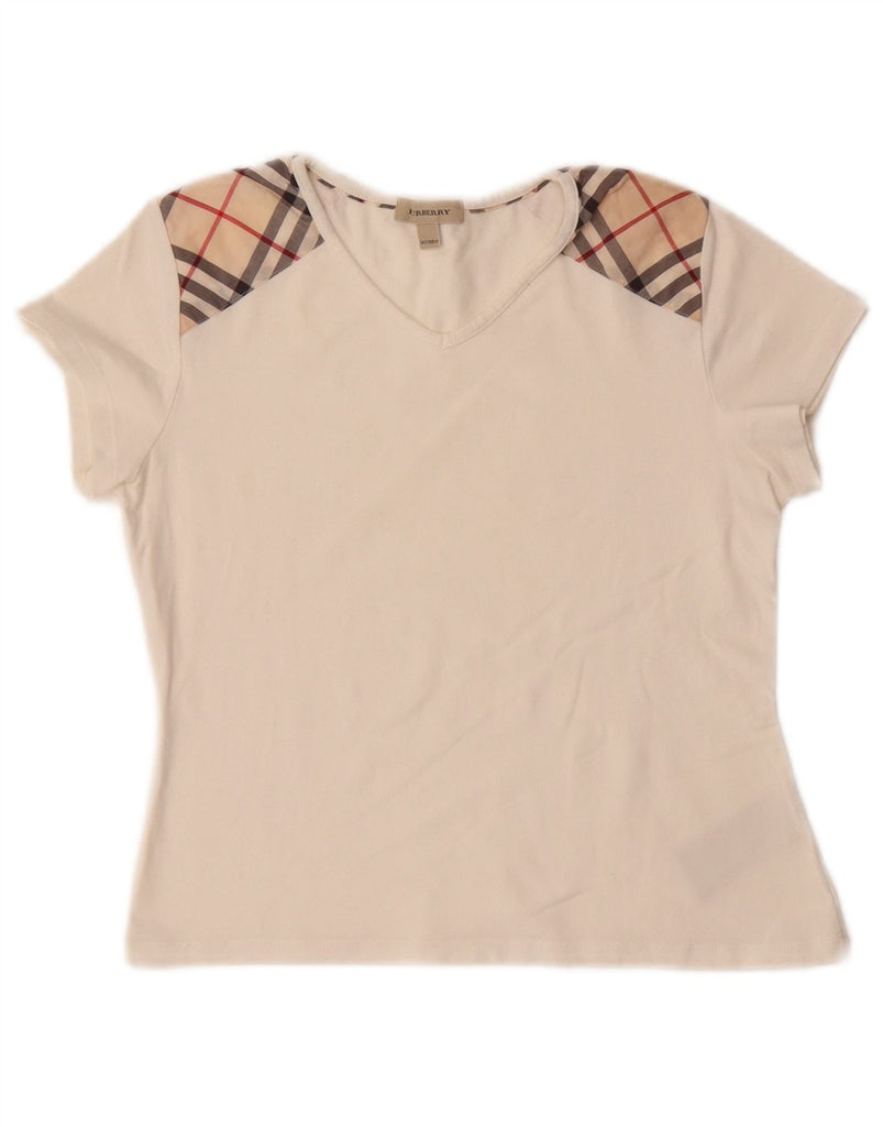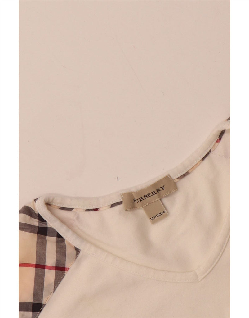- AI Description: This Burberry girls T-shirt top is crafted from soft white jersey fabric. It features a classic V-neckline and short sleeves. The pullover style ensures easy wear. A regular fit offers comfortable movement. The design includes a distinctive plaid graphic, incorporating the brands iconic pattern. A subtle logo accent adds a signature touch. This classic piece combines comfort with a stylish recognisable aesthetic.