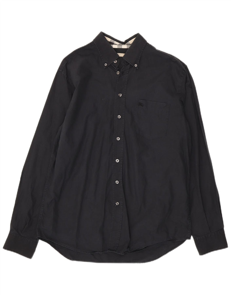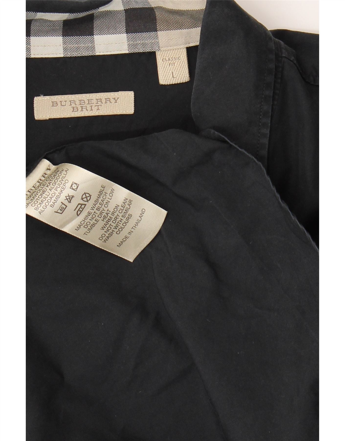 - AI Description: This Burberry Brit mens shirt is crafted from 100 percent woven cotton, offering a smooth, comfortable feel. Its deep black hue provides a versatile, sophisticated base. The collared neckline and full button closure present a classic, refined look. Long sleeves complete the traditional silhouette. Designed for a classic regular fit, it includes practical pockets. A subtle logo accent adds a signature touch.