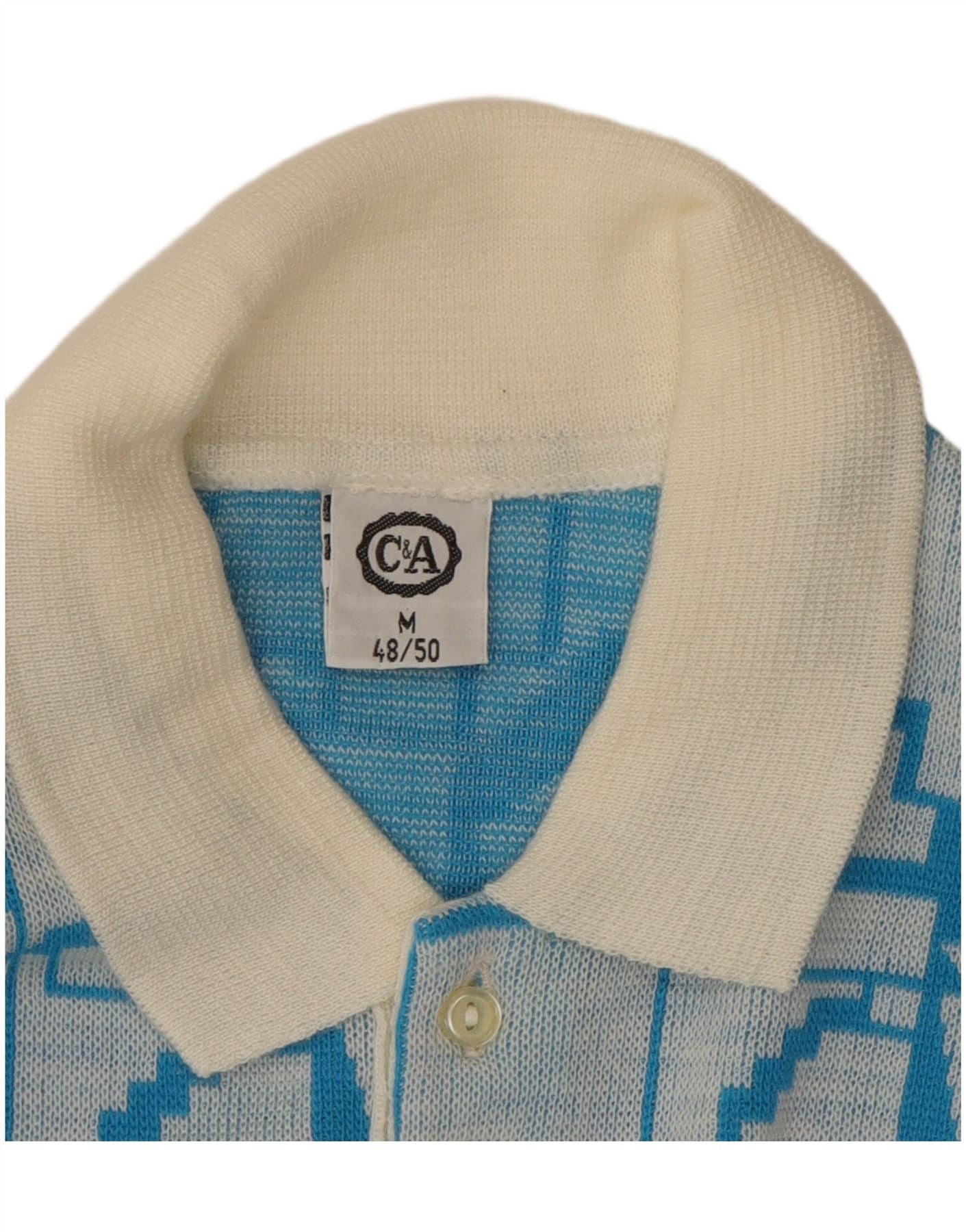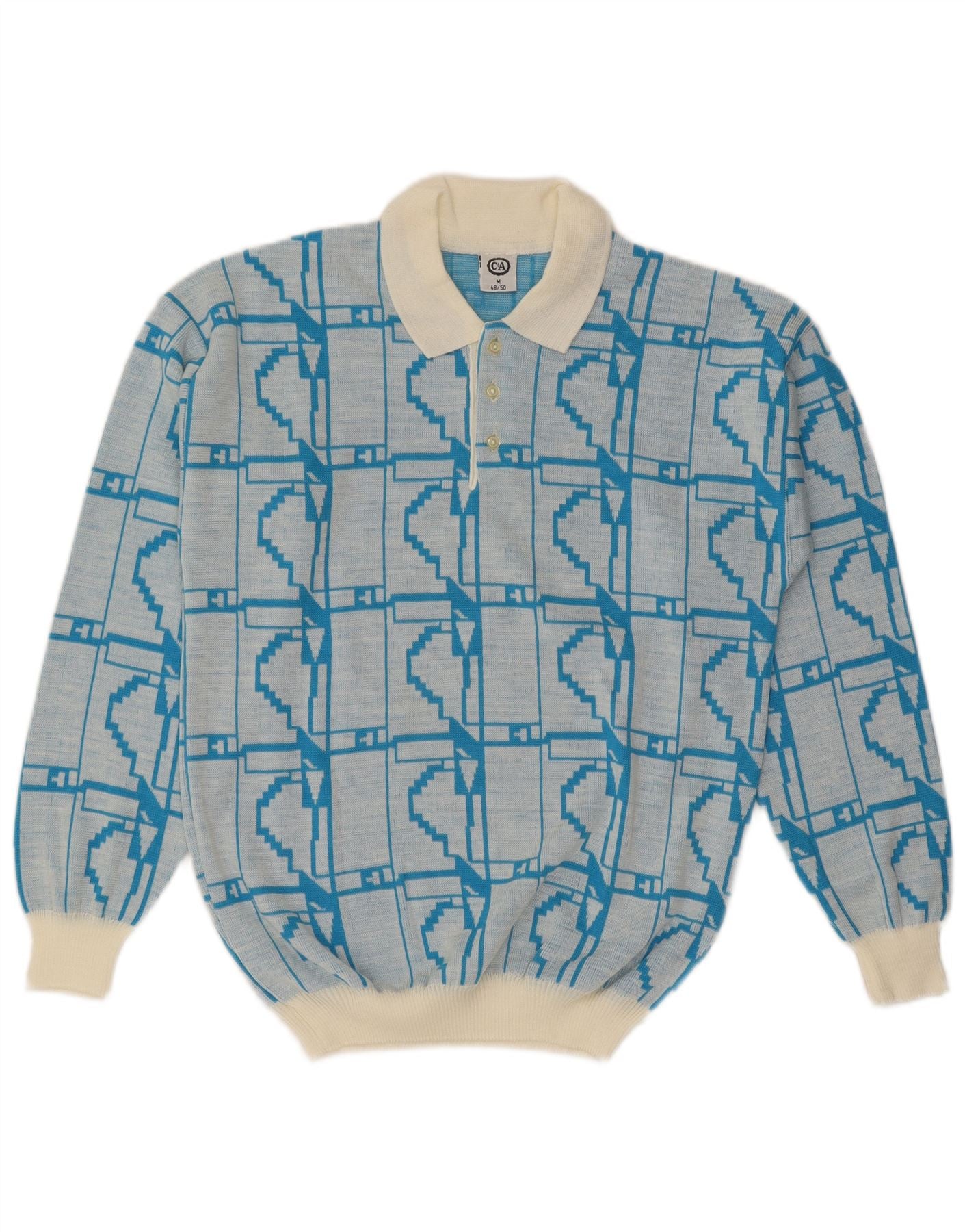 - AI Description: This C&A mens Polo Neck Jumper Sweater is crafted from a comfortable blue knit fabric. It features a distinctive geometric pattern throughout. The collared neckline with button closure offers a classic polo neck style. Long sleeves and a regular fit ensure comfort and versatility. Its retro style adds a timeless appeal, perfect for smart casual wear.