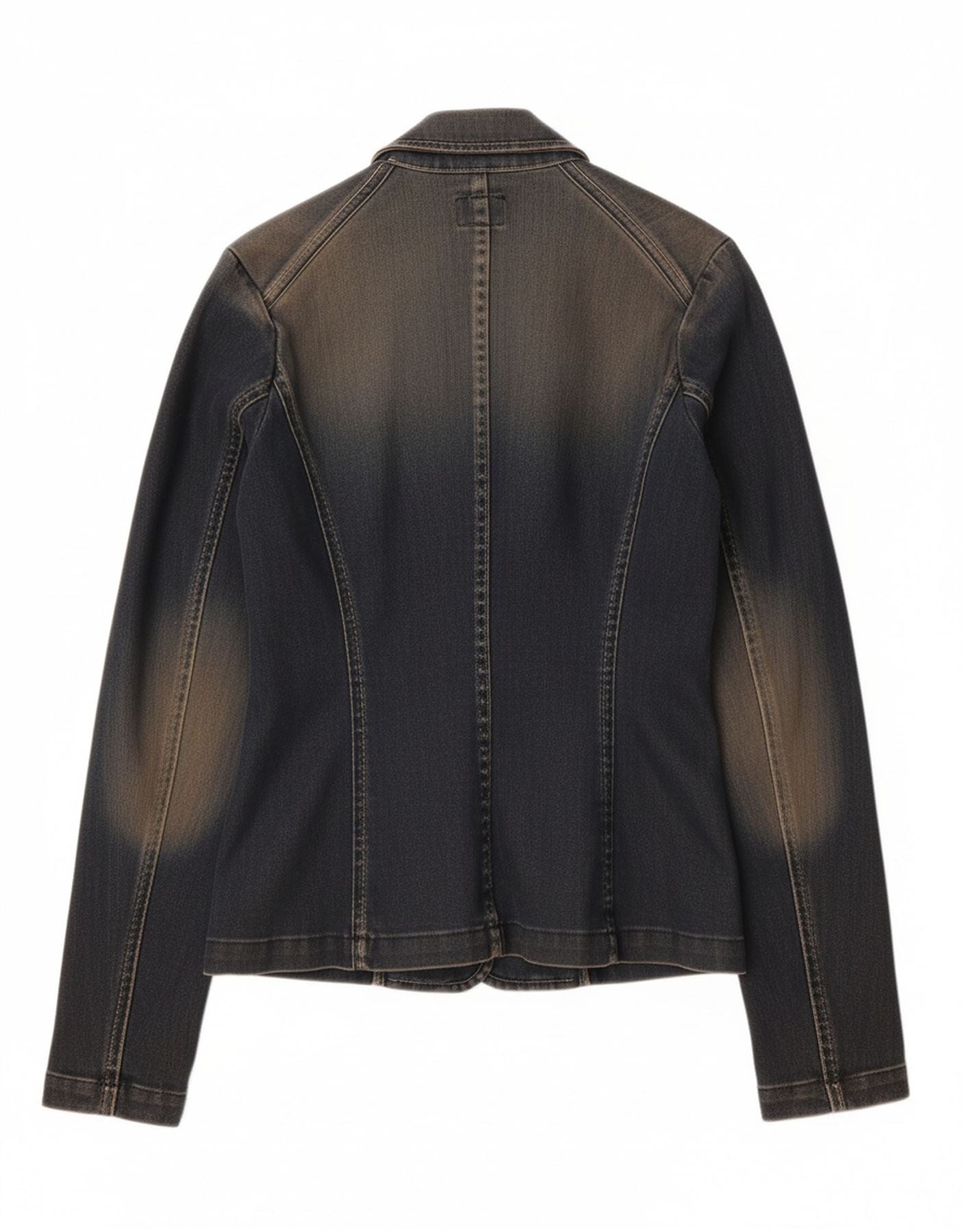 - AI Condition: Pre-owned | grade: Moderate | location: General fading throughout the denim jacket, particularly on the shoulders, sleeves, and body panels | type: Discoloration