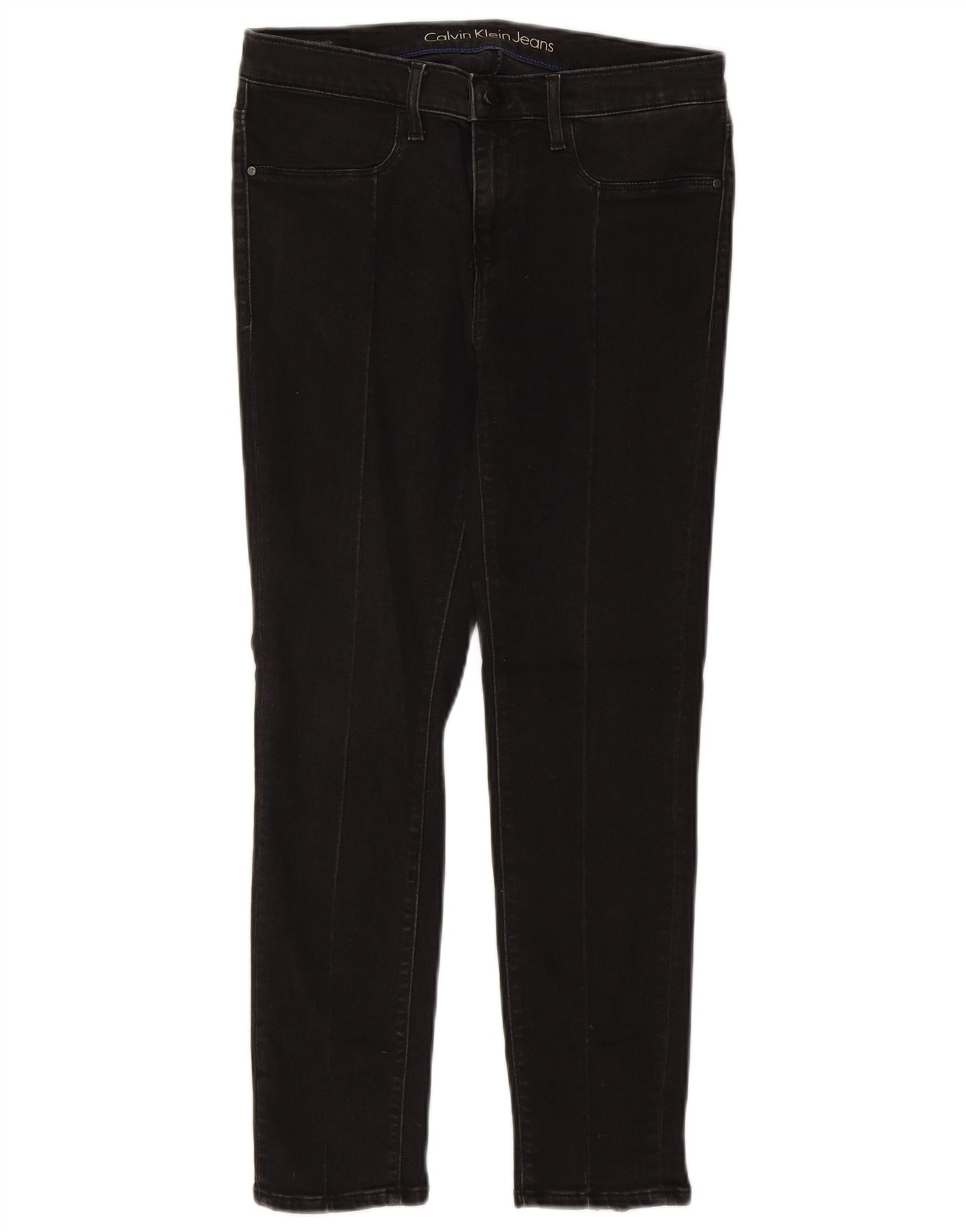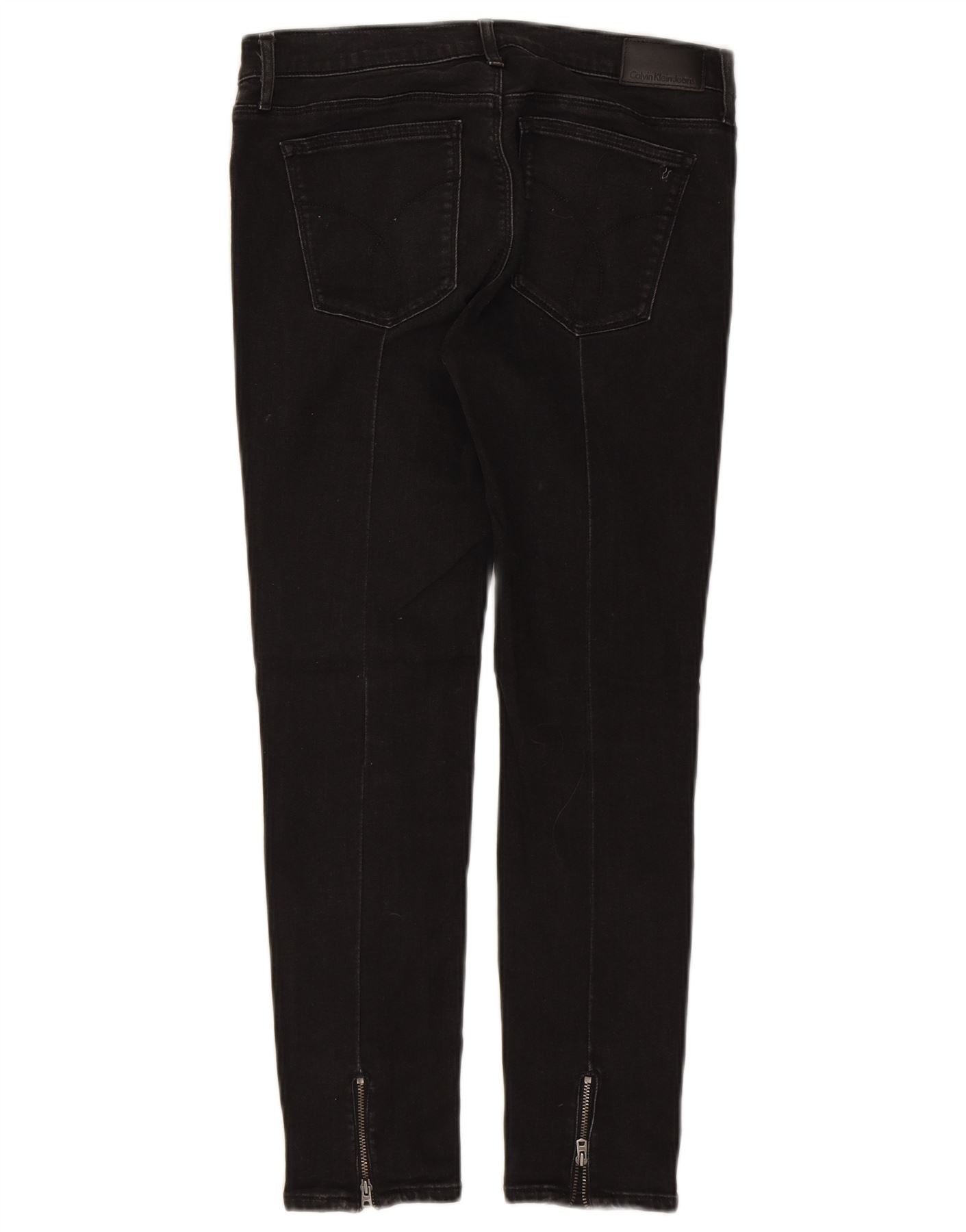 - AI Description: These Calvin Klein women's skinny jeans are crafted from premium black denim, offering a sleek, smooth finish. They feature a mid-rise waist for a comfortable fit and a classic button and zip closure. The slim cut gracefully tapers to the ankle. Practical pockets are included, and stylish ankle zips add a contemporary accent, creating a sharp, modern silhouette.