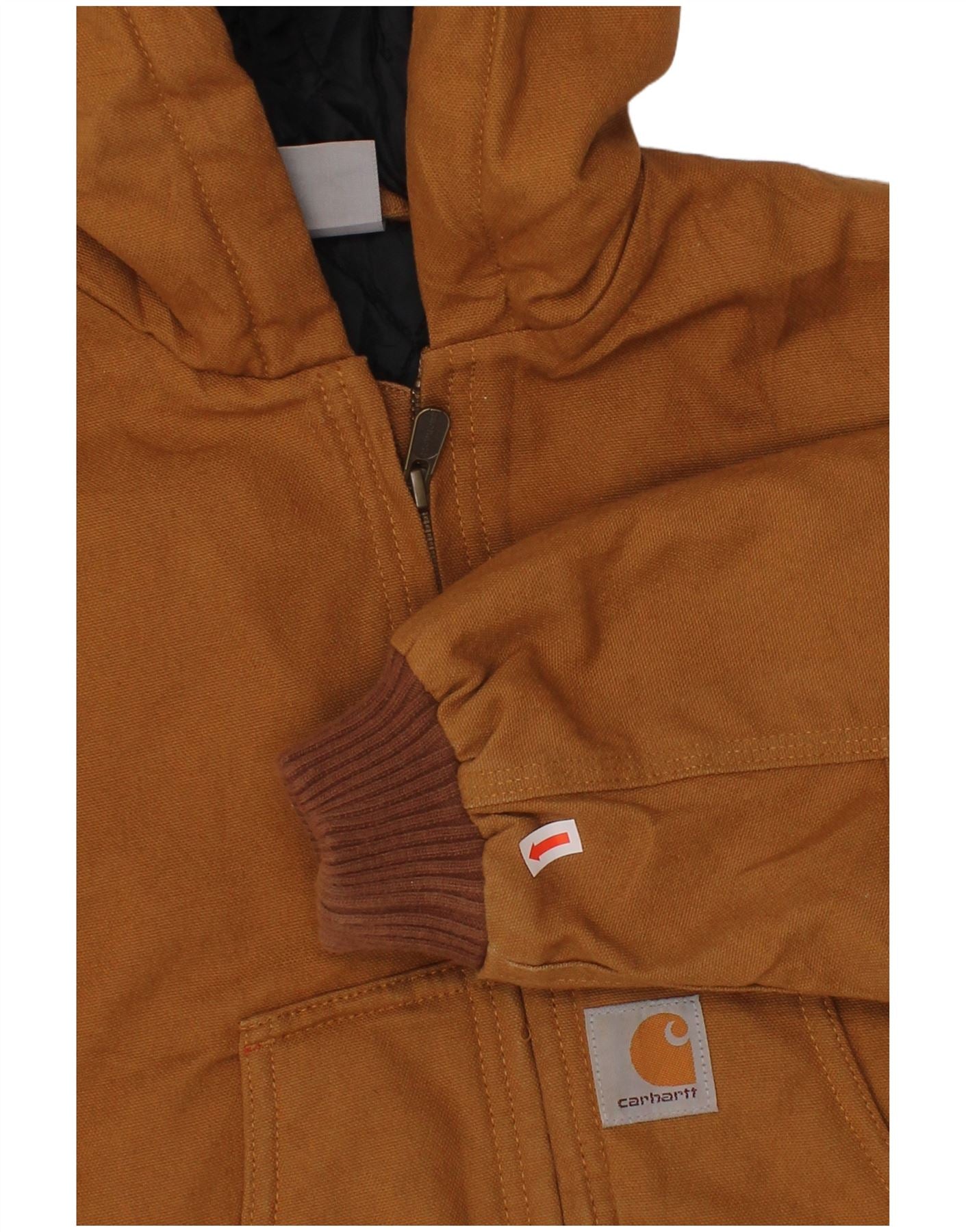 - AI Description: This Carhartt boys' bomber jacket is crafted from durable brown canvas, offering a robust feel. It features a quilted lining for added warmth and comfort. The classic regular fit ensures ease of movement. It includes a practical hood and long sleeves. A full zip closure secures the front. Multiple pockets provide utility. A subtle Carhartt logo adds a signature accent.