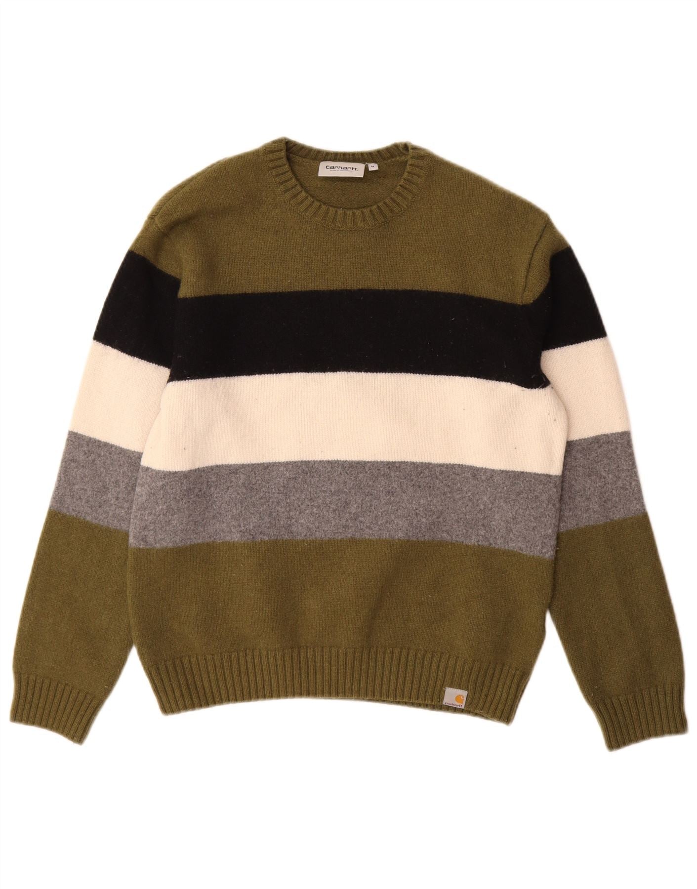 CARHARTT Jersey de cuello redondo para hombre de lana de cordero a rayas de color caqui medio
