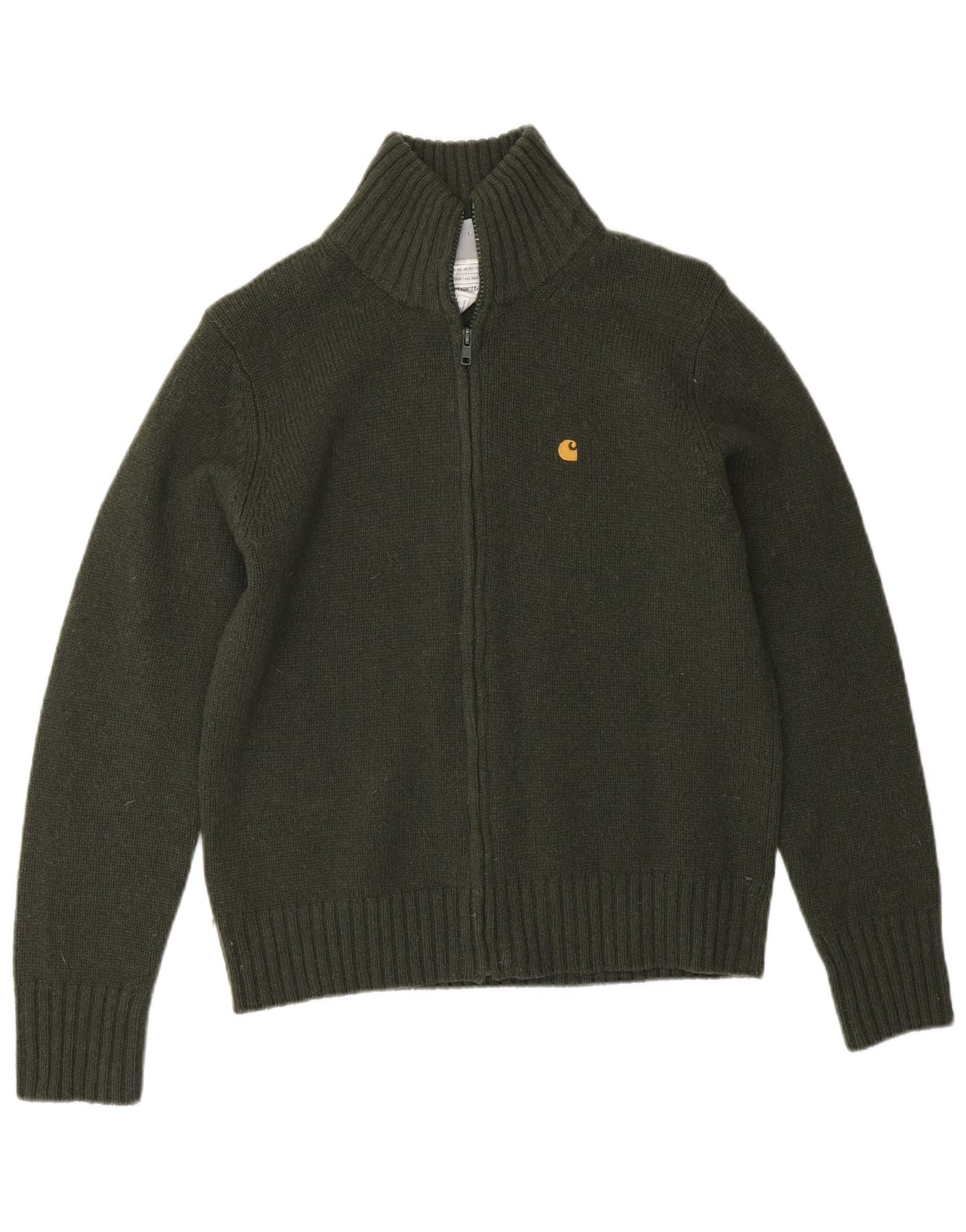 - AI Description: This Carhartt mens cardigan sweater is crafted from 100 percent Shetland wool, offering a warm, knit texture. It features a high mock neck and a full zip closure for versatile styling. Long sleeves finish with cuffed details. The regular fit ensures comfort and a classic silhouette. A subtle logo accent completes the design.