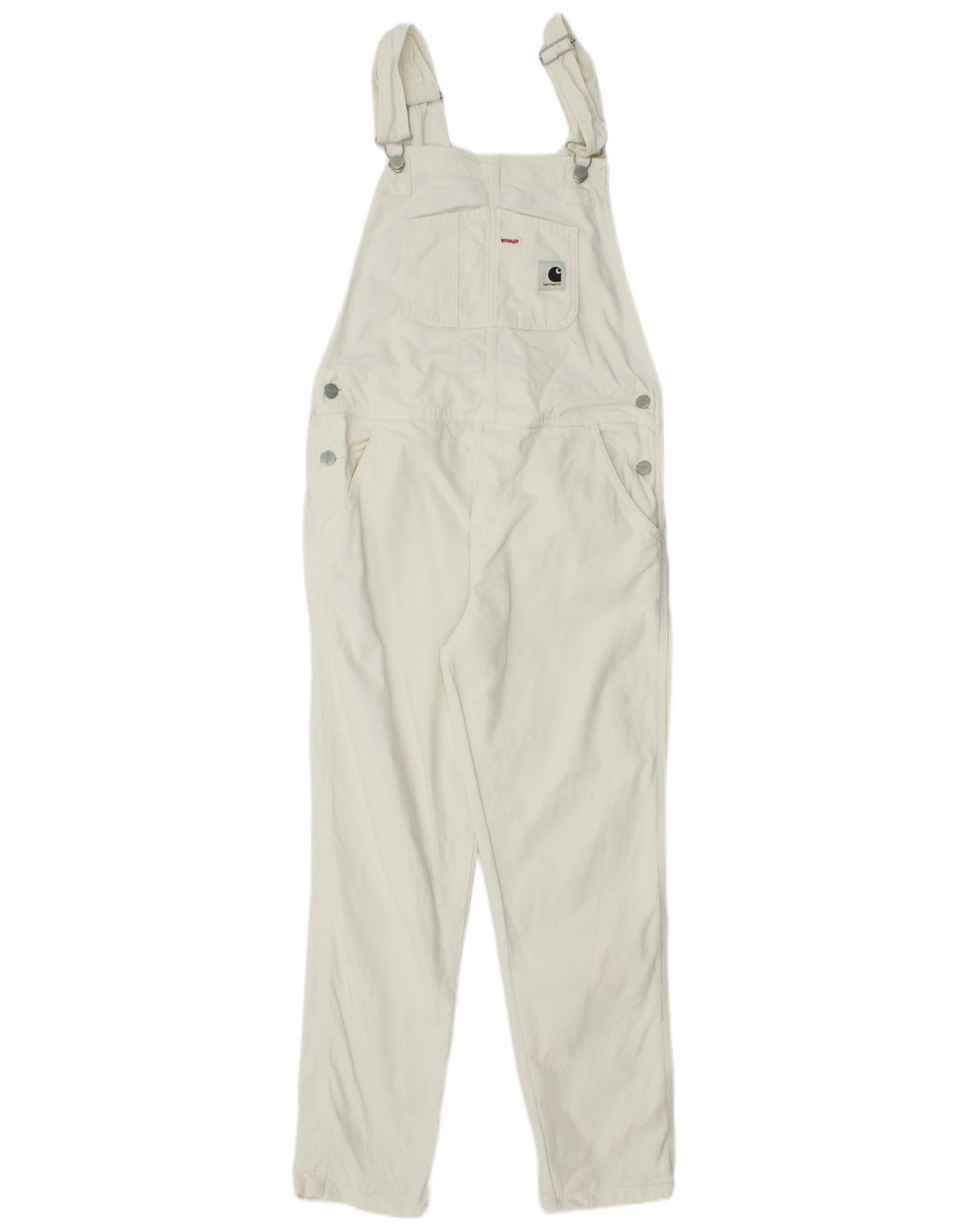 - AI Description: This Carhartt women's dungaree jumpsuit is crafted from durable off white cotton canvas. It includes a hint of elastane for comfortable movement. The classic dungaree silhouette features adjustable buckle straps. A regular fit ensures comfortable wear throughout the day. Multiple pockets add practical utility to the design. Tonal buttons provide subtle accenting, completing this timeless piece.