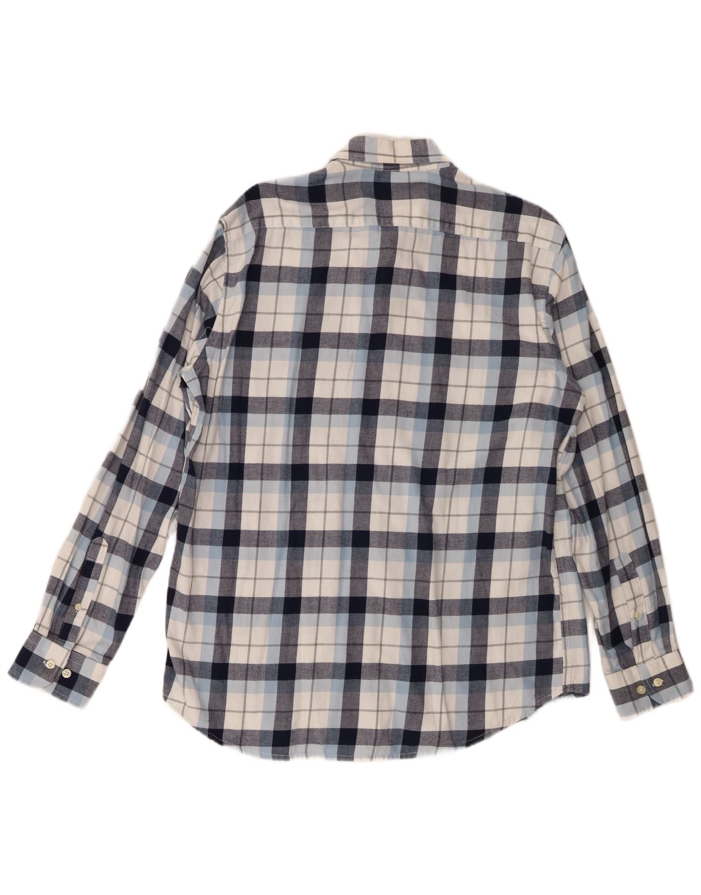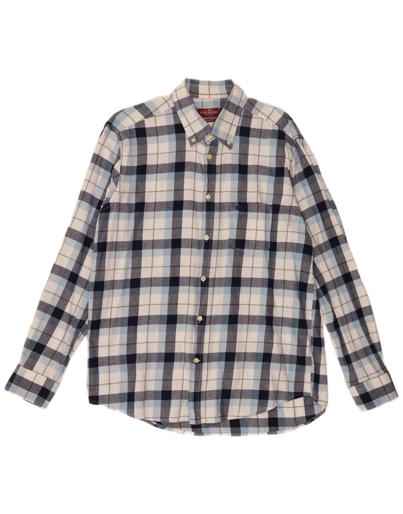 - Descripción de IA: Esta camisa de franela Carrera para hombre está confeccionada con un suave tejido 100 % algodón. Presenta un patrón de cuadros clásico en tonos azul marino, blanco y azul claro. El escote con cuello y la parte delantera completa con botones ofrecen un estilo atemporal. Manga larga rematada con puños abotonados. Un único bolsillo en el pecho añade un detalle práctico. El corte regular garantiza comodidad para el estilo diario.