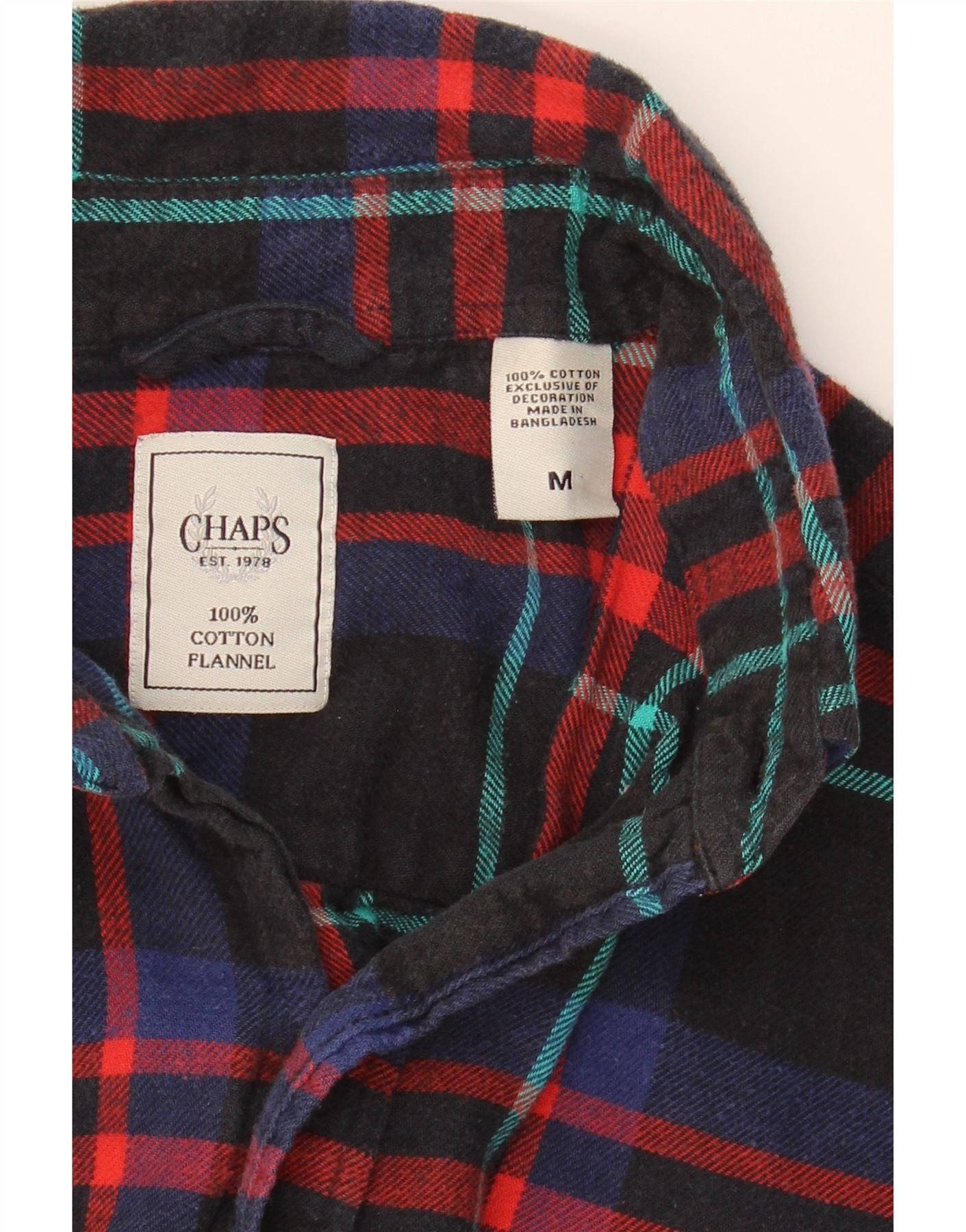- AI Description: This pre-owned Chaps flannel shirt is a classic wardrobe staple for men. Crafted from 100% cotton in Bangladesh, this multicoloured, plaid flannel shirt features a regular fit, long sleeves, and a collared neckline. The button-down closure and button accents add to the traditional style. Details include a checked pattern, pockets, and a collared design. Label size M. In excellent condition.