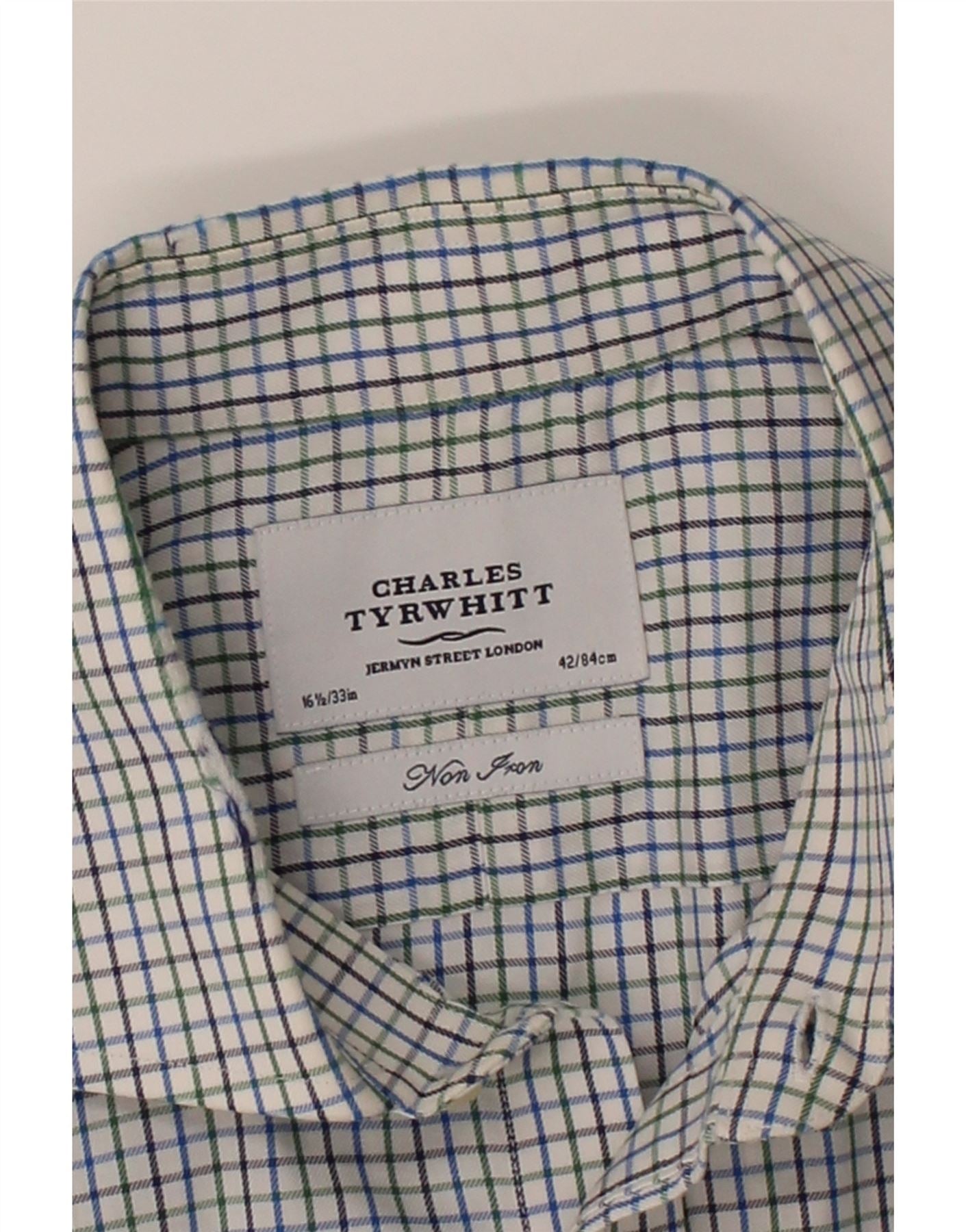 - AI Description: This pre-owned Charles Tyrwhitt shirt is in excellent condition. Crafted from woven fabric, this classic style shirt features a regular fit, long sleeves, and a collared neckline. The blue check pattern adds a touch of sophistication. It has a button closure and is labelled as size 16 1/2 /33in. A versatile addition to any gentleman's wardrobe.
