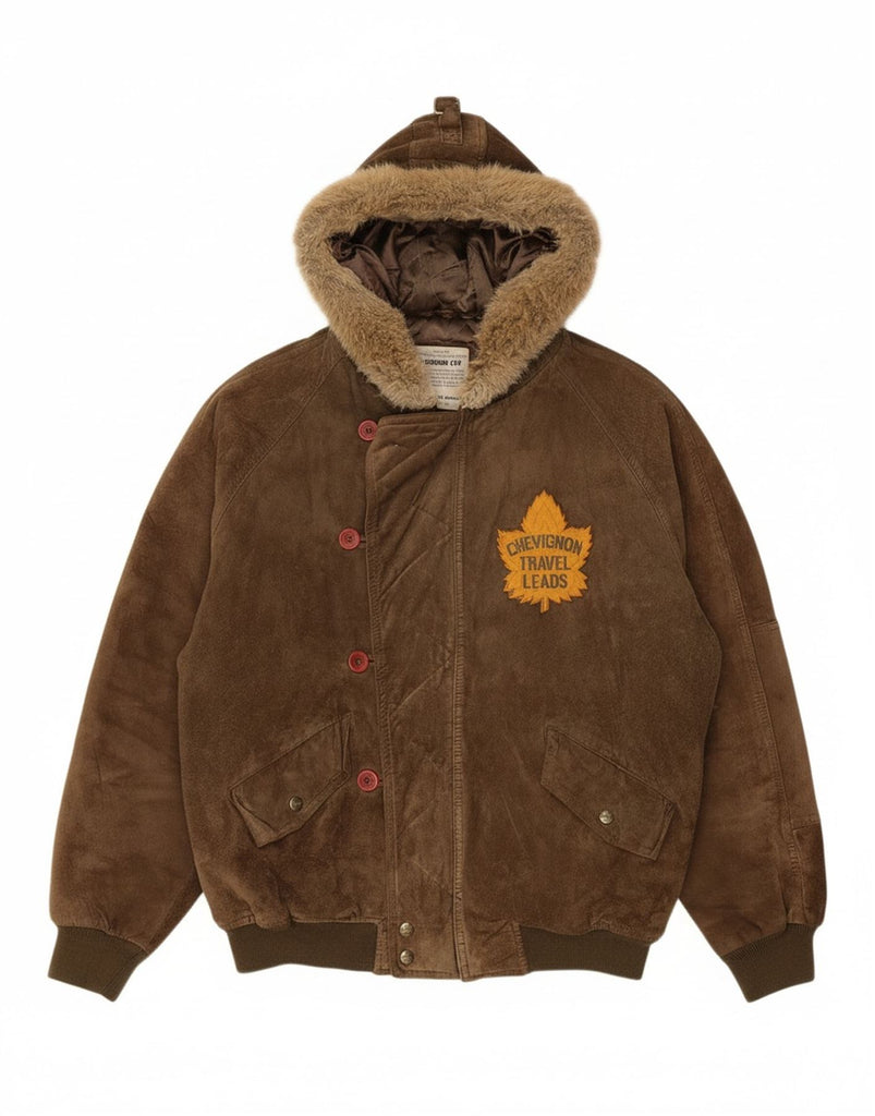 CHEVIGNON Mens Hooded Suede Bomber Jacket UK 40 Large Brown Leather