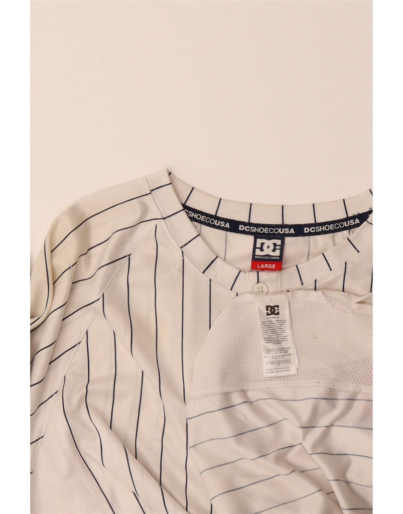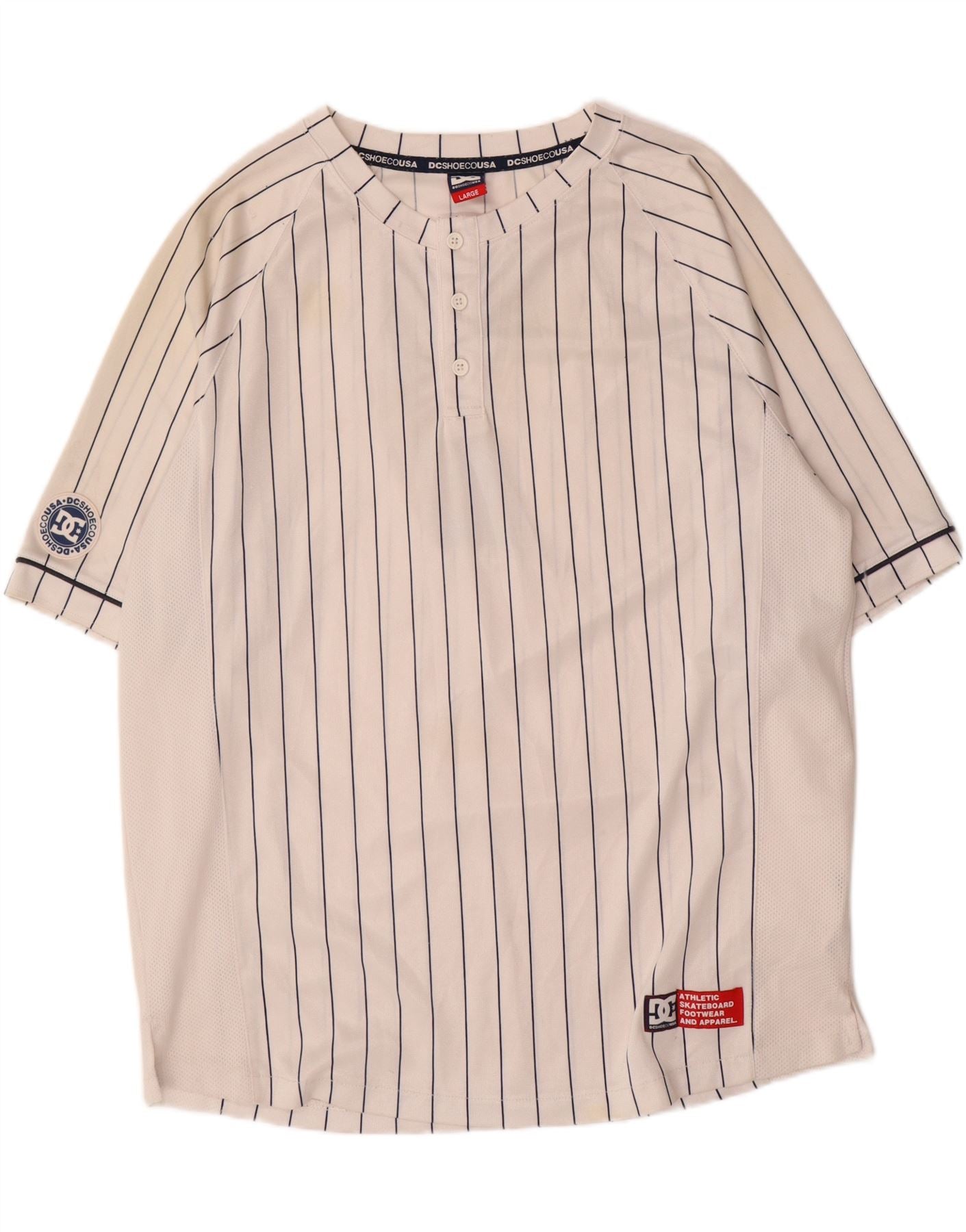 - AI Description: This DC men's Jersey Top is expertly crafted from 100% polyester, offering a lightweight and breathable woven finish. It features a classic round neckline and short sleeves for optimal comfort during activity. A subtle pinstripe pattern lends classic sporting style, enhanced by a practical button neck closure. The regular fit ensures ease of movement. This performance top also includes a distinctive logo accent, perfect for active wear.