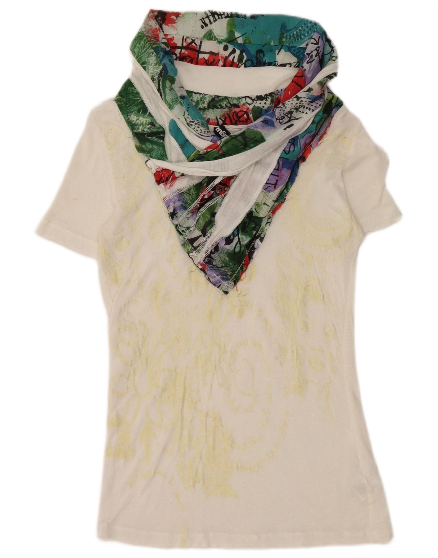 - Descripción de IA: Esta camiseta con gráfico Desigual para mujer está confeccionada con suave punto de algodón blanco. Presenta un clásico escote redondo y manga corta. El ajuste regular garantiza comodidad y facilidad de uso. Un sutil estampado floral adorna el cuerpo principal. Un detalle de bufanda multicolor vibrante está integrado en el escote, añadiendo un toque gráfico único. Este top liviano ofrece un estilo de diseñador distintivo.