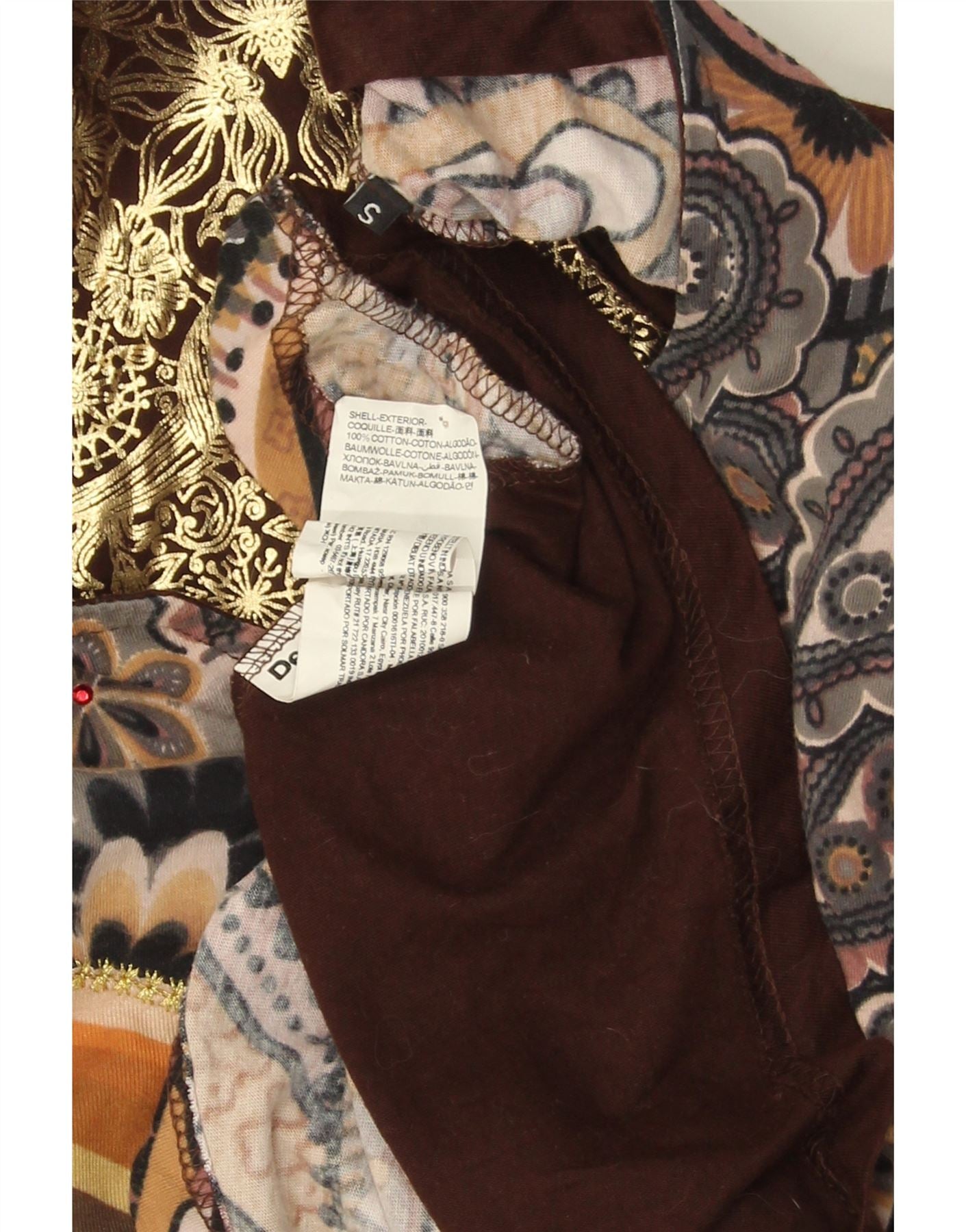 - Descripción de IA: Esta camiseta gráfica para mujer Desigual está confeccionada con una suave mezcla de punto de algodón, viscosa, poliéster y elastano. Presenta una base marrón intensa con un patrón abstracto y paisley vibrante. El escote en V y las mangas largas ofrecen una silueta clásica. Su corte regular se complementa con un dobladillo asimétrico. Los sutiles detalles en brillo realzan el diseño bohemio. Este top combina comodidad con un estilo distintivo.