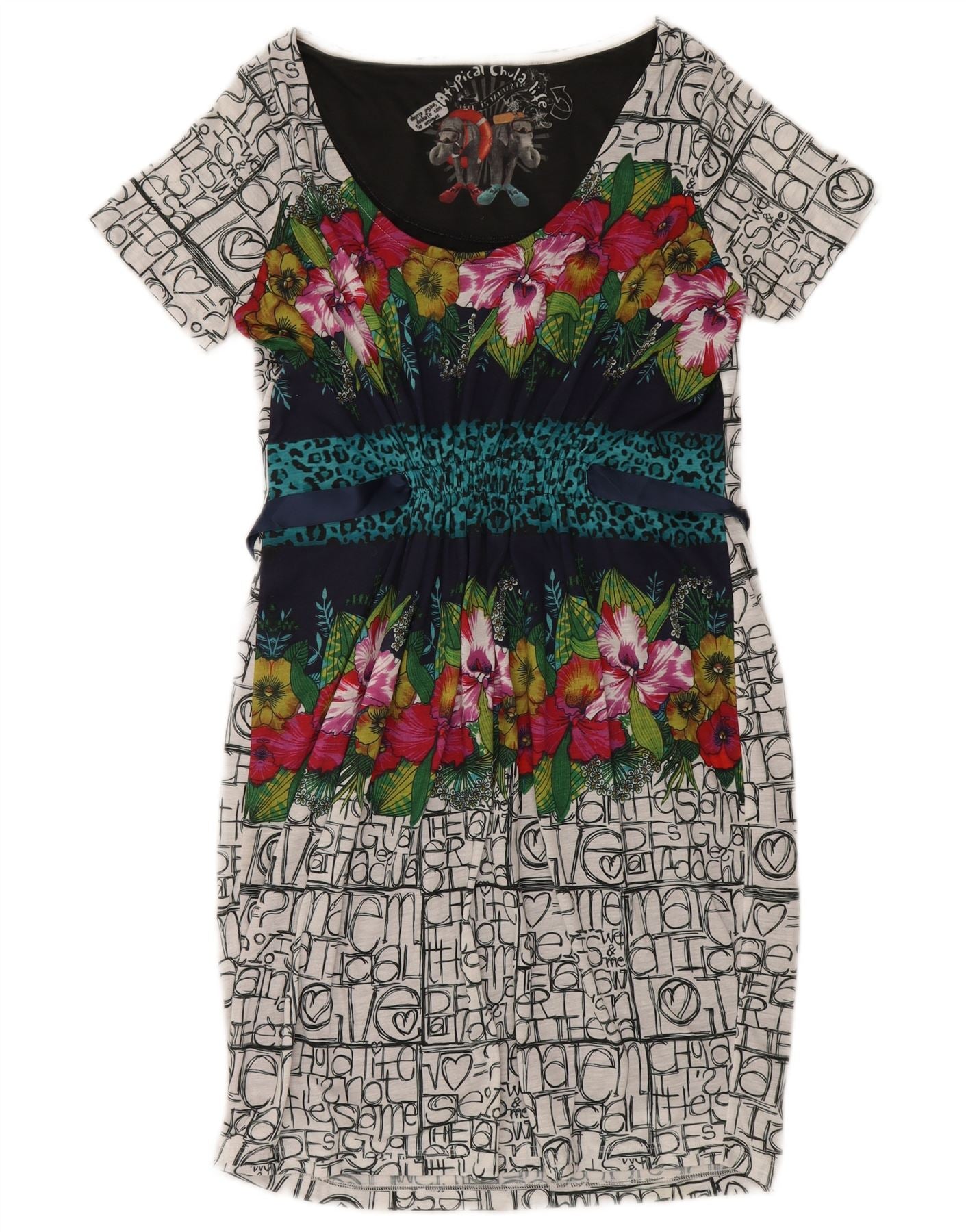 - Descripción de IA: Este vestido de mujer Desigual está confeccionado con una tela mezclada 100 por ciento poliéster, que ofrece una textura suave. Presenta escote redondo y manga corta, aportando una silueta clásica. El vestido de corte regular tiene un largo mini. Un vibrante estampado floral multicolor adorna el corpiño, en contraste con un patrón abstracto en la falda. Una correa a juego ciñe la cintura, añadiendo definición y estilo.