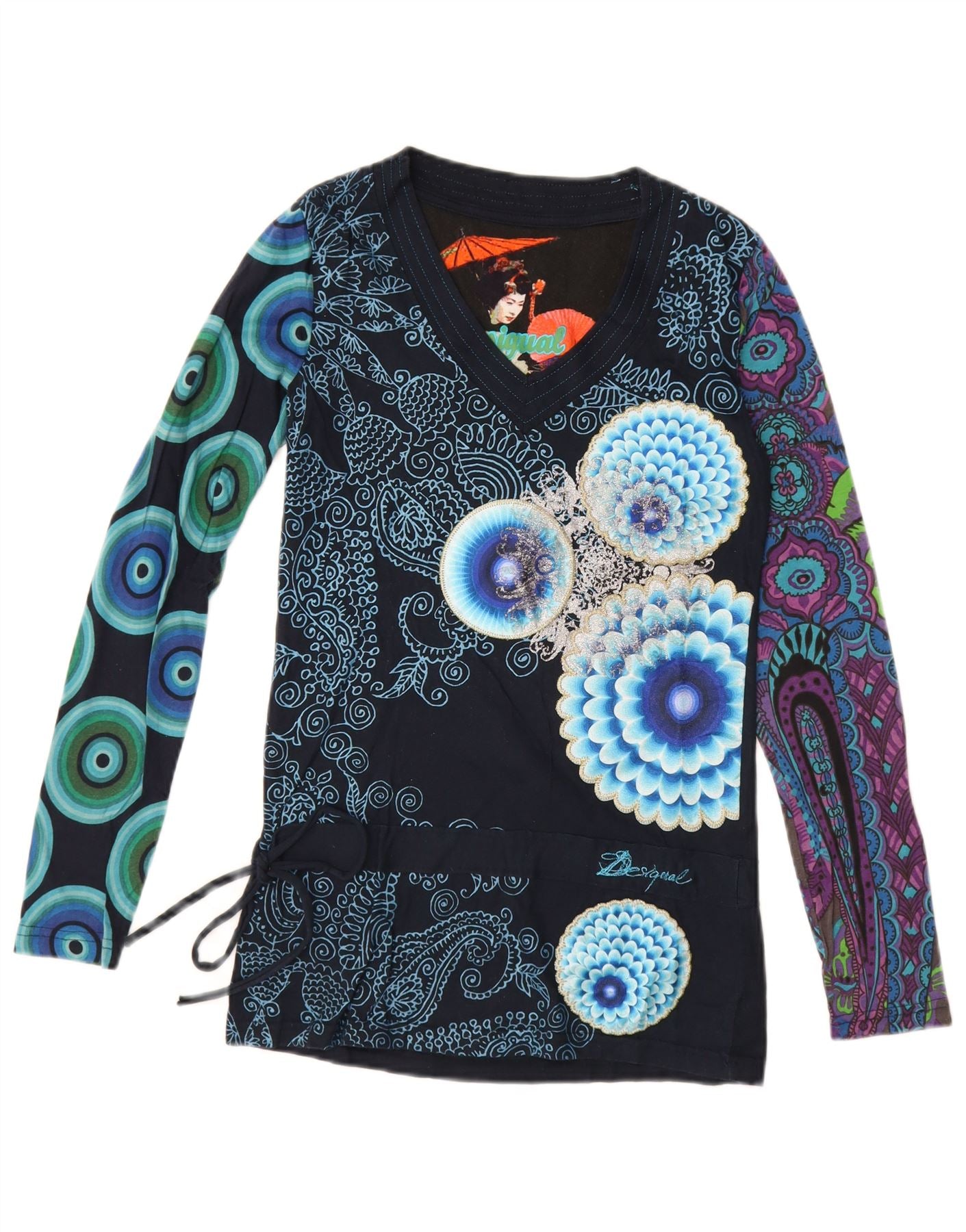 Desigual Mujer Gráfico Top Manga Larga Reino Unido 10 Pequeño Azul Marino