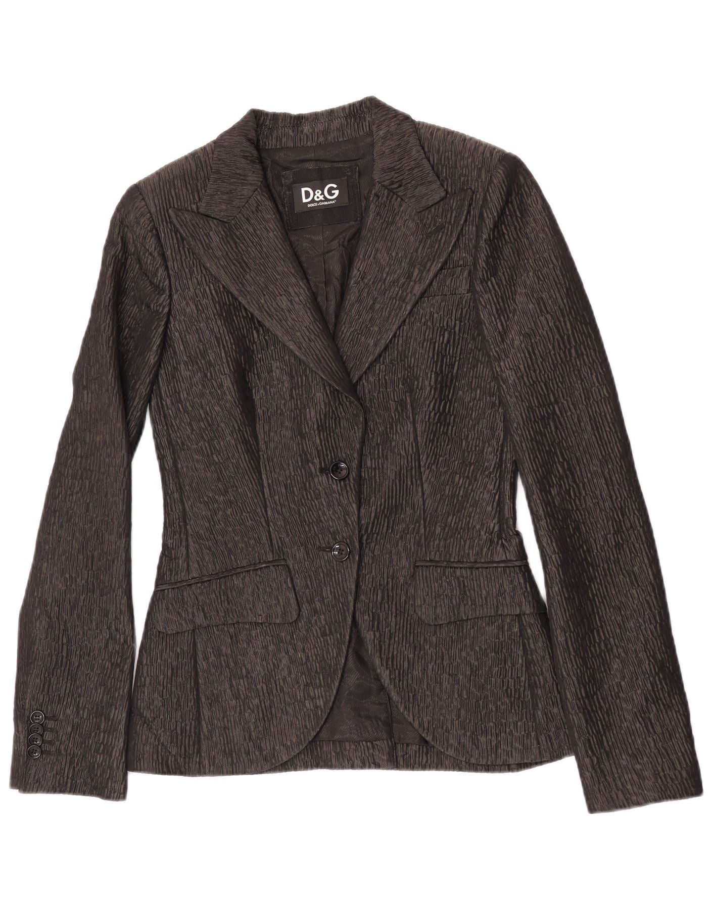 - Descripción de IA: Este blazer de 2 piezas para mujer de Dolce & Gabbana está confeccionado con una lujosa mezcla de viscosa y acetato tejido en negro. La tela presenta un acabado texturizado sutil que agrega profundidad. Tiene escote de cuello clásico y manga larga. El cierre frontal de dos botones y el corte regular crean una silueta refinada. Bolsillos funcionales completan este elegante diseño.