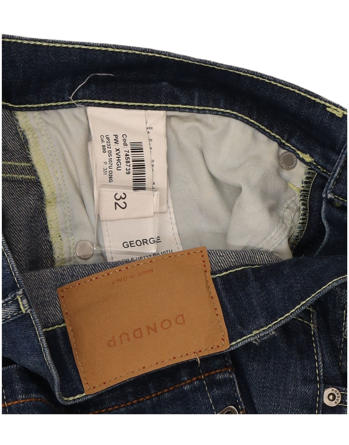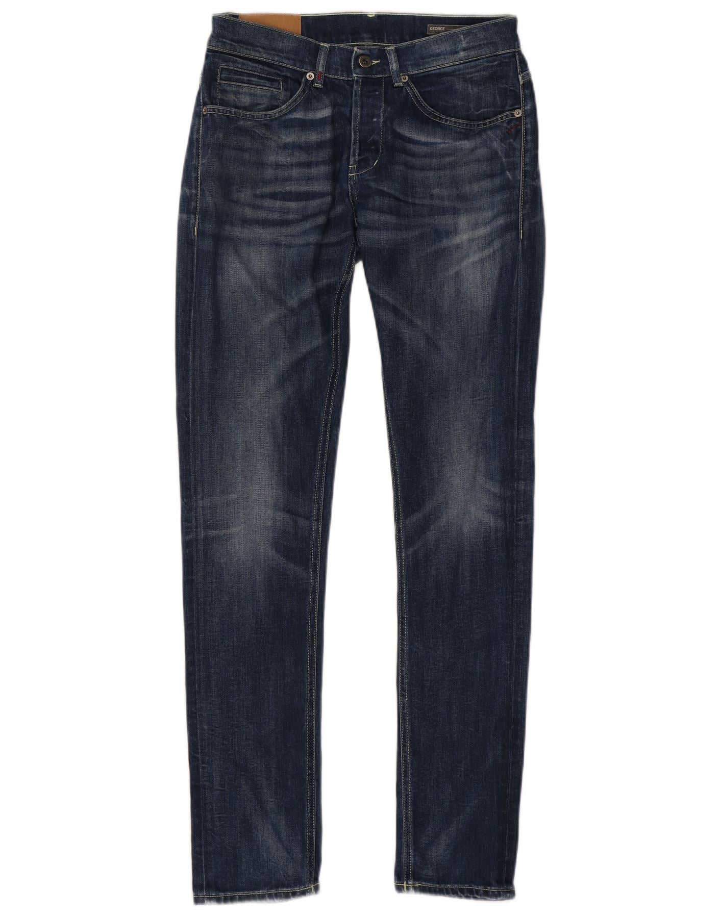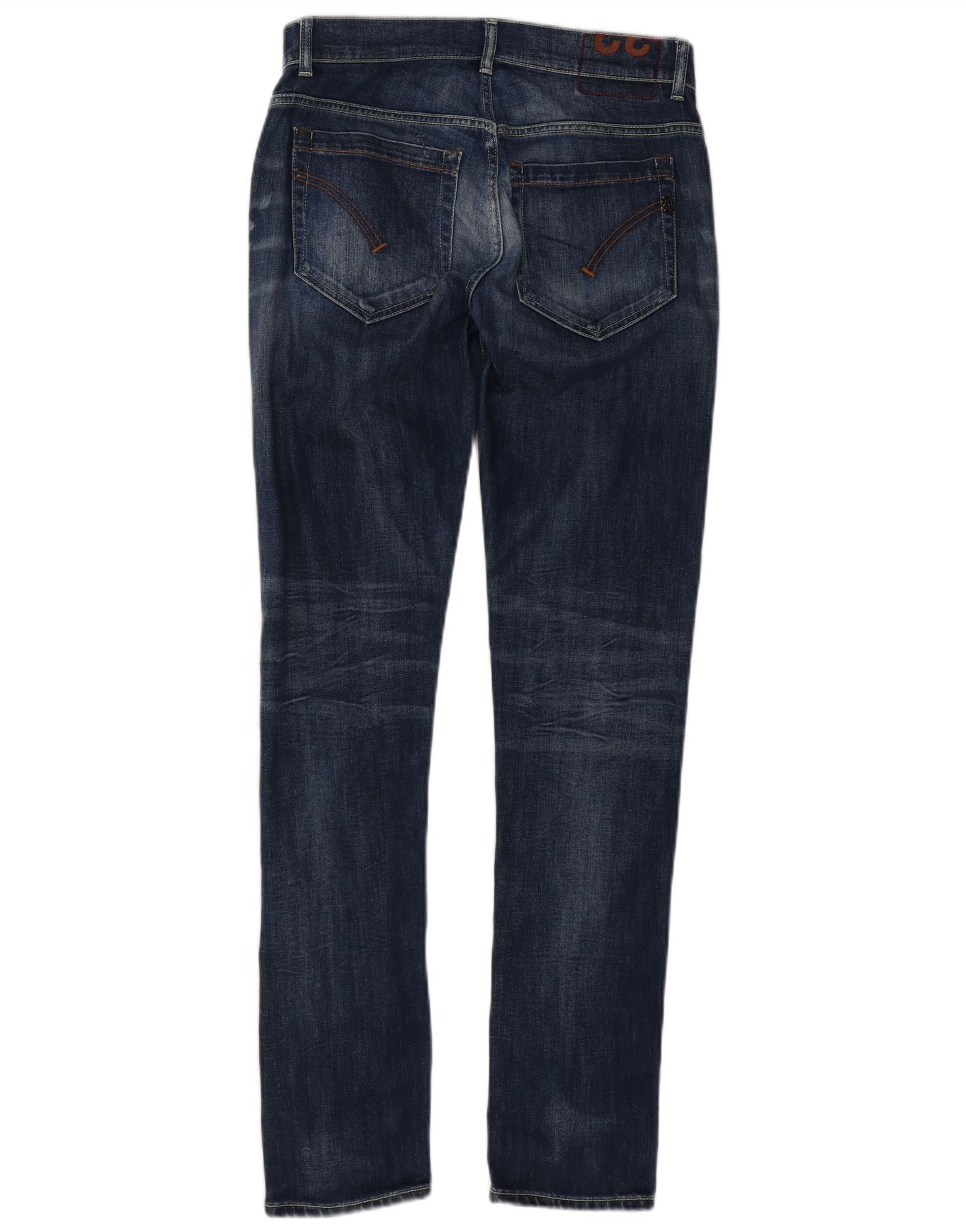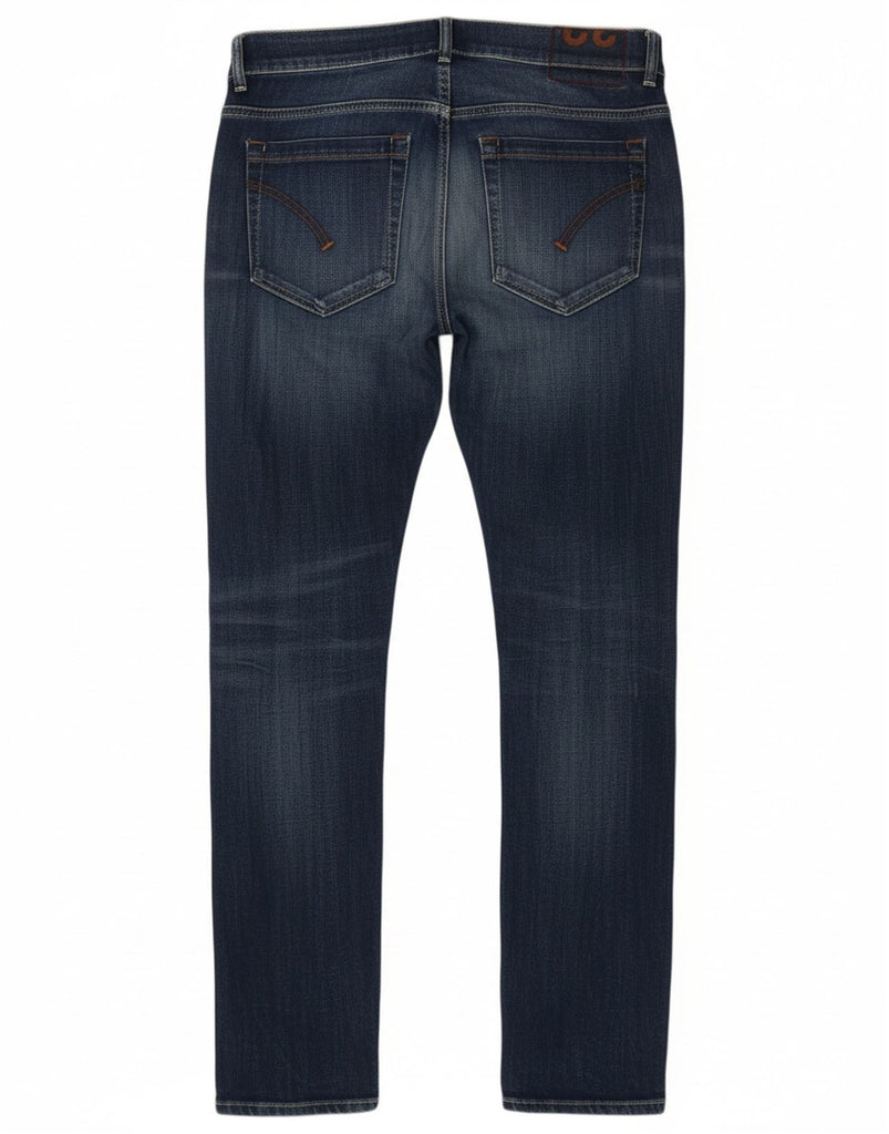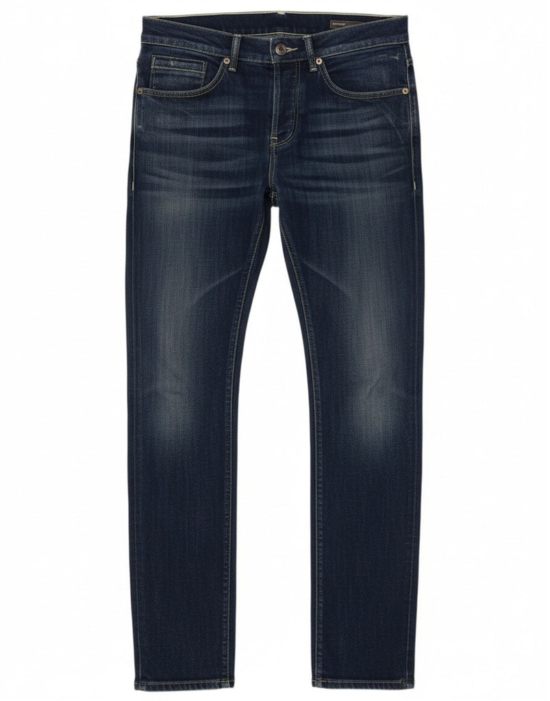 - AI Description: These Dondup men's slim jeans are crafted from blue denim with a distressed finish. They feature a button closure and a slim fit through the leg. Classic pockets offer practicality. A subtle logo accent completes the design, adding a refined touch. The contemporary cut ensures a modern silhouette, perfect for versatile styling.