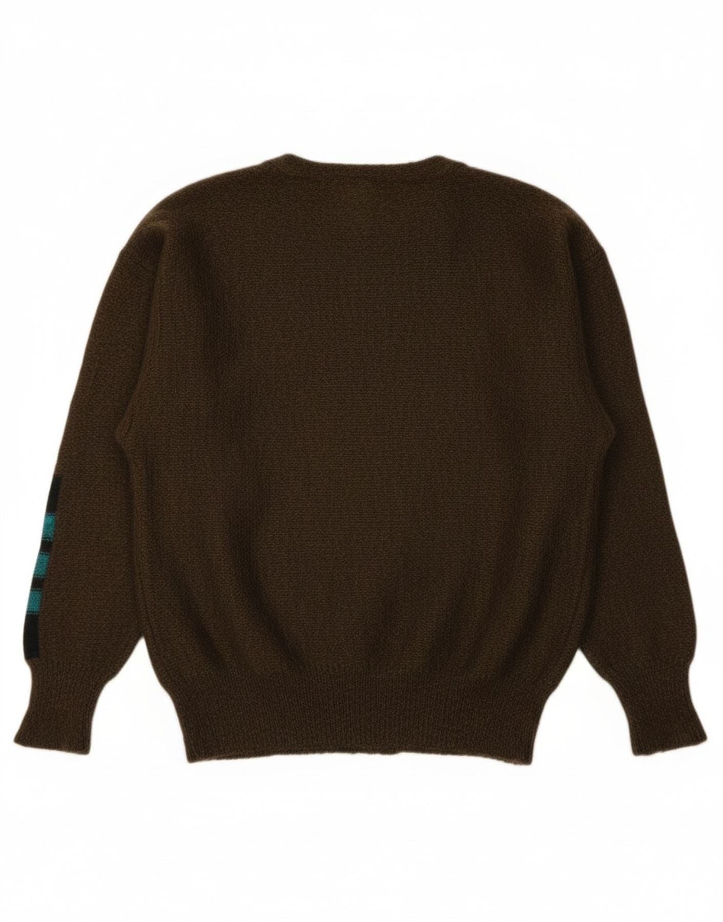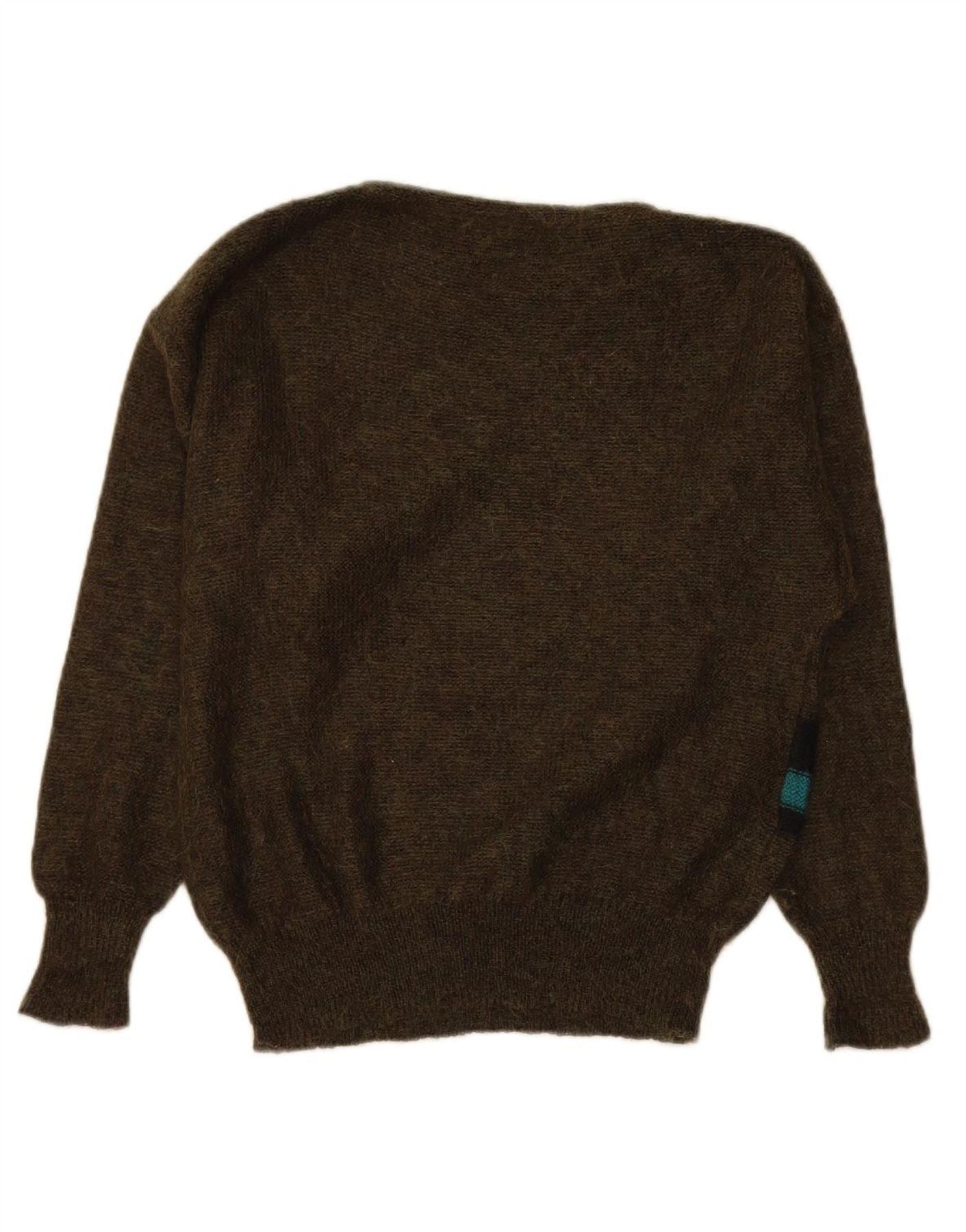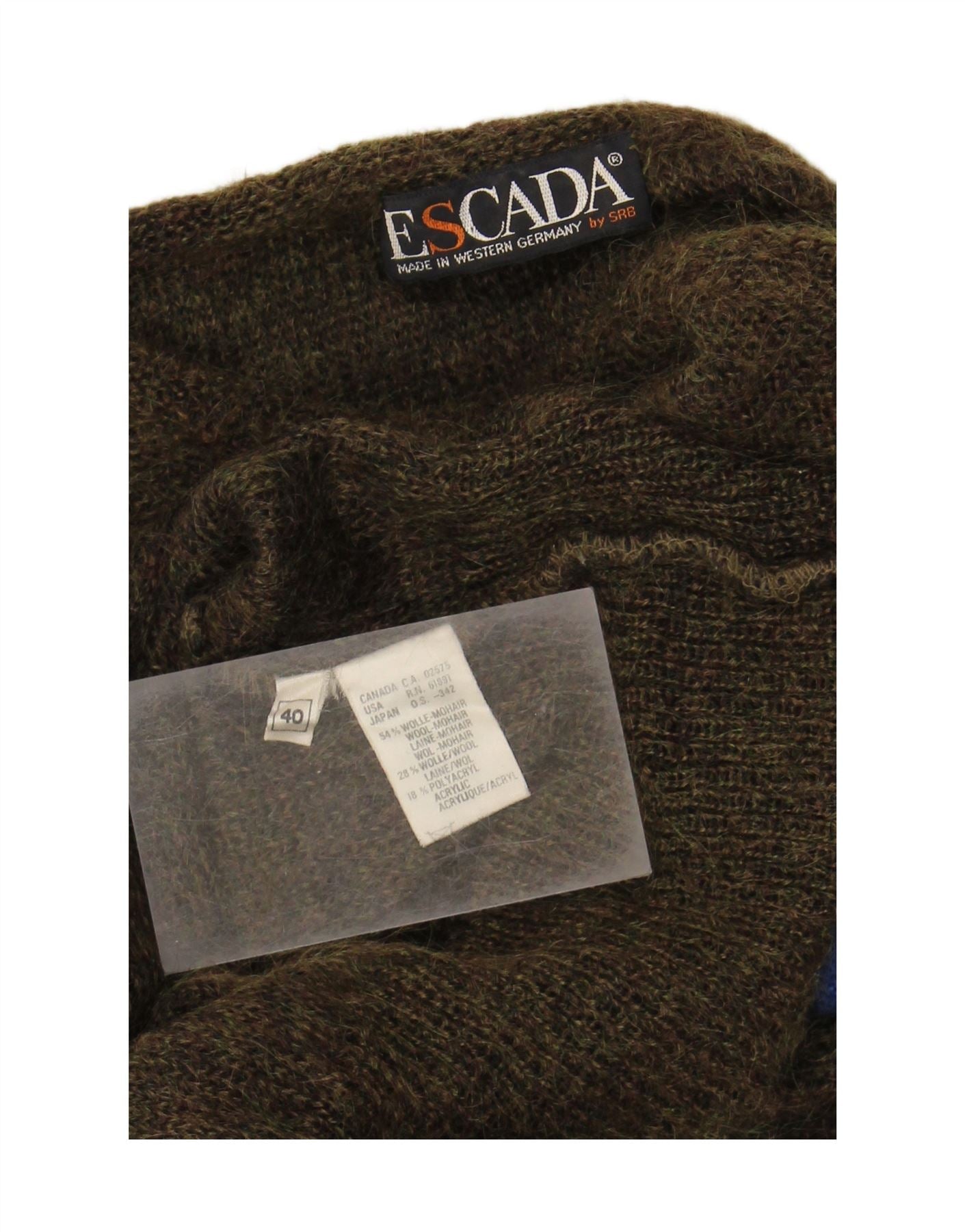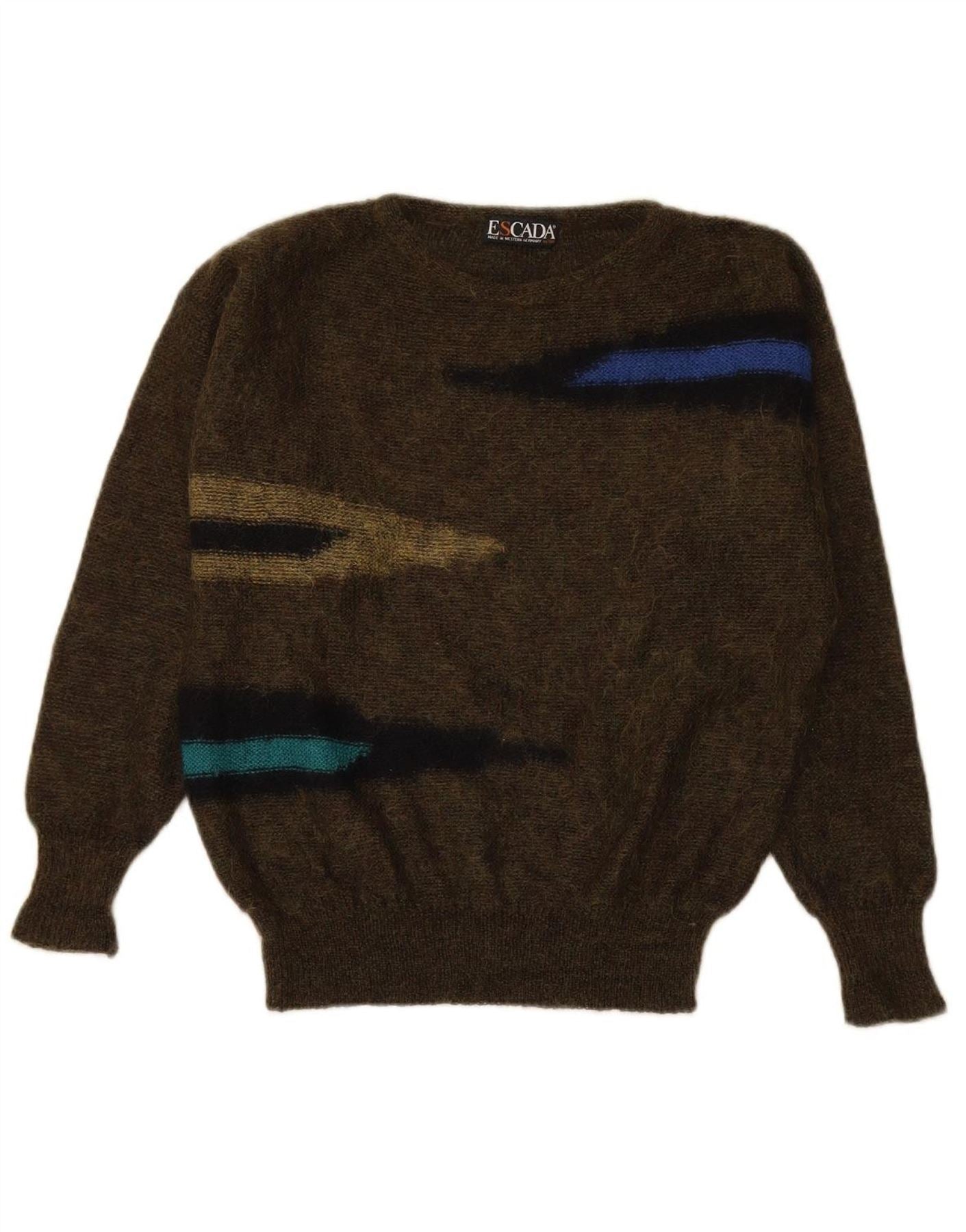 - AI Description: This Escada womens crew neck jumper sweater is crafted from a luxurious mohair blend knit. The soft, textured fabric offers a relaxed fit, perfect for comfortable wear. It features a classic round neckline and long sleeves. A striking striped pattern in khaki and muted tones gives a distinct retro appeal. This pullover design combines warmth with sophisticated style.