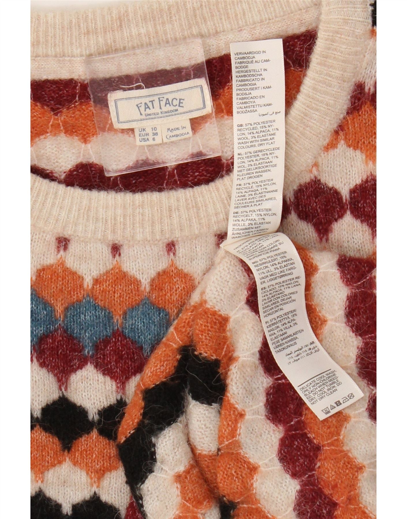 - Descripción de IA: Este suéter tipo jersey con cuello redondo para mujer de Fat Face está confeccionado con una mezcla de punto suave y cálido de poliéster, poliéster reciclado, alpaca y lana. Presenta un patrón geométrico multicolor vibrante en todas partes. El escote redondo y las mangas largas con puños ofrecen un ajuste clásico y cómodo. Su corte regular garantiza facilidad de uso. Este diseño de jersey brinda elasticidad y comodidad para el uso diario.