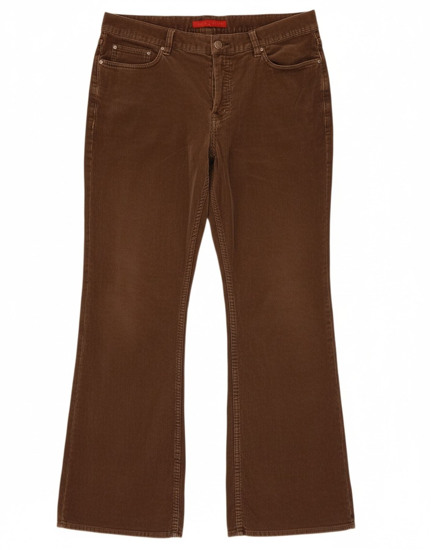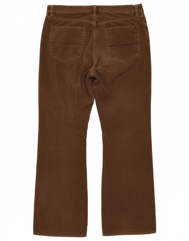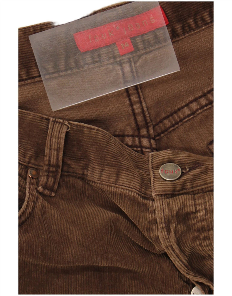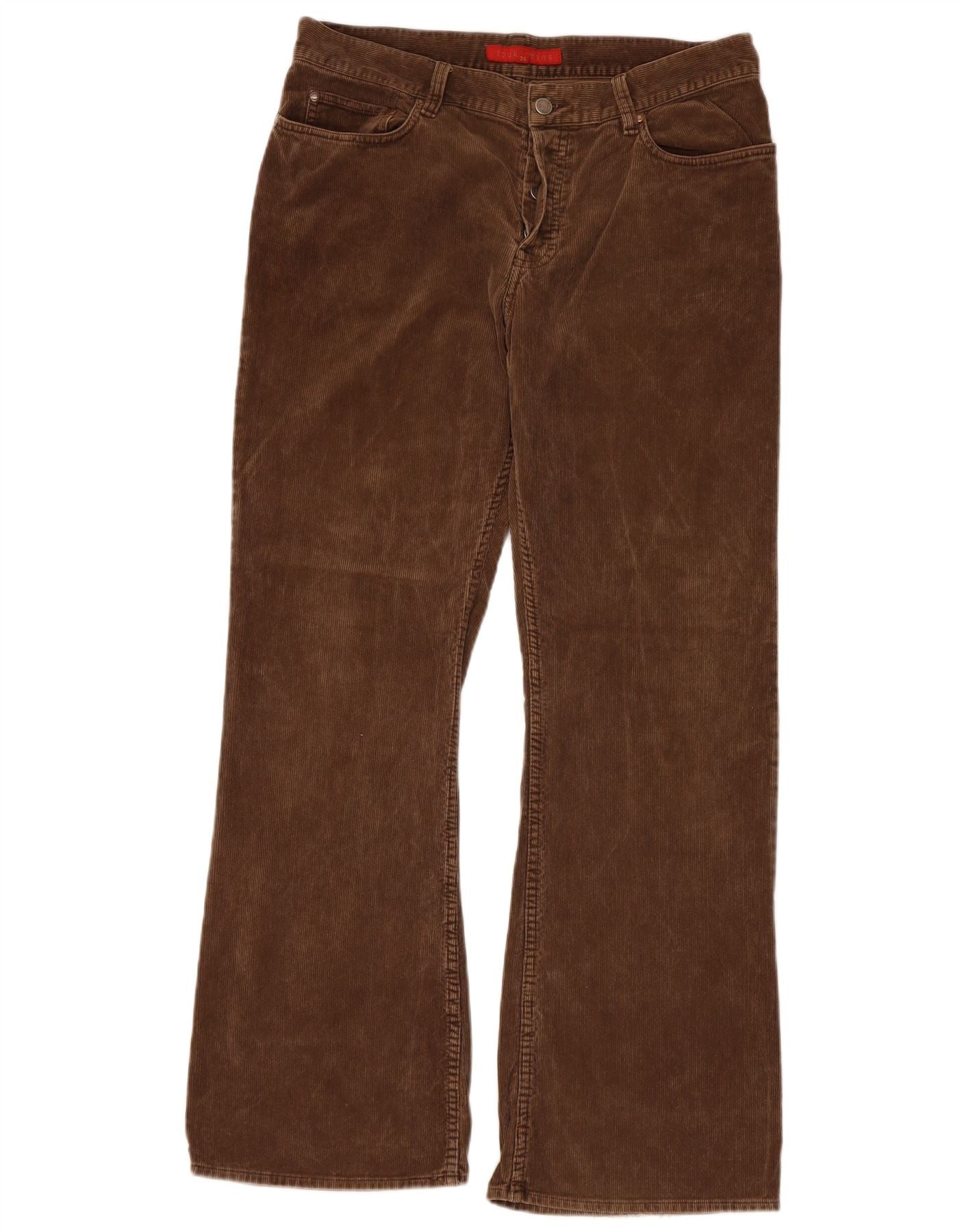- AI Description: These Fcuk men's Corduroy Trousers are crafted from rich brown corduroy, offering a soft, ribbed texture. They feature a regular fit with a bootcut leg, flaring gently towards the ankle. A button closure ensures a secure fit. Practical pockets provide functionality. A subtle logo detail adds a branded touch.