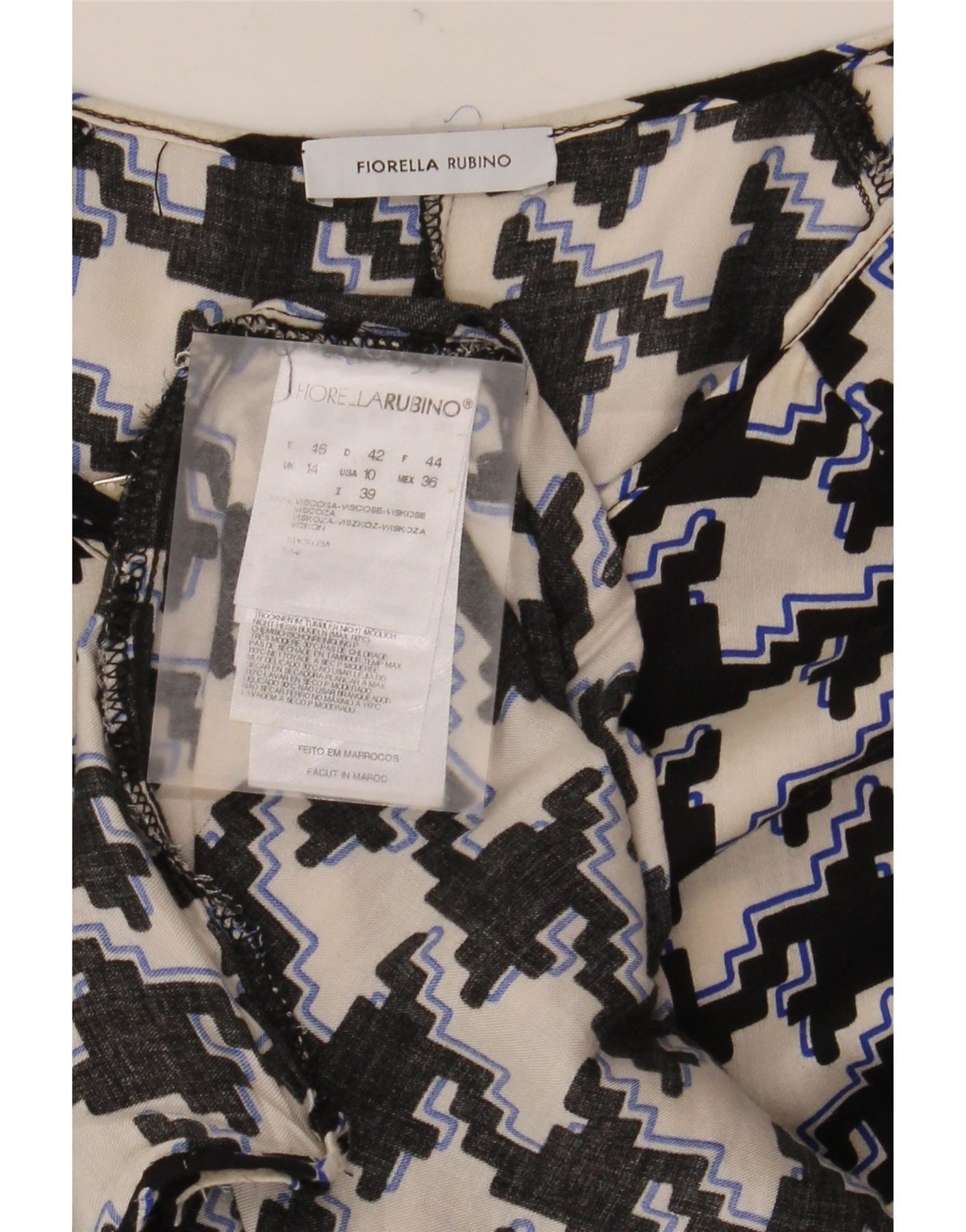 - Descripción de IA: Esta blusa para mujer de Fiorella Rubino está confeccionada con rayón de viscosa suave y ofrece una caída suave y fluida. Presenta un llamativo patrón de pata de gallo multicolor en negro, blanco roto y azul. El escote redondo y las mangas largas crean una silueta clásica. Un cierre de cremallera en la parte posterior garantiza un acabado impecable. Su corte regular ofrece comodidad. Esta pieza combina un patrón atemporal con una comodidad moderna, perfecta para un estilo versátil.