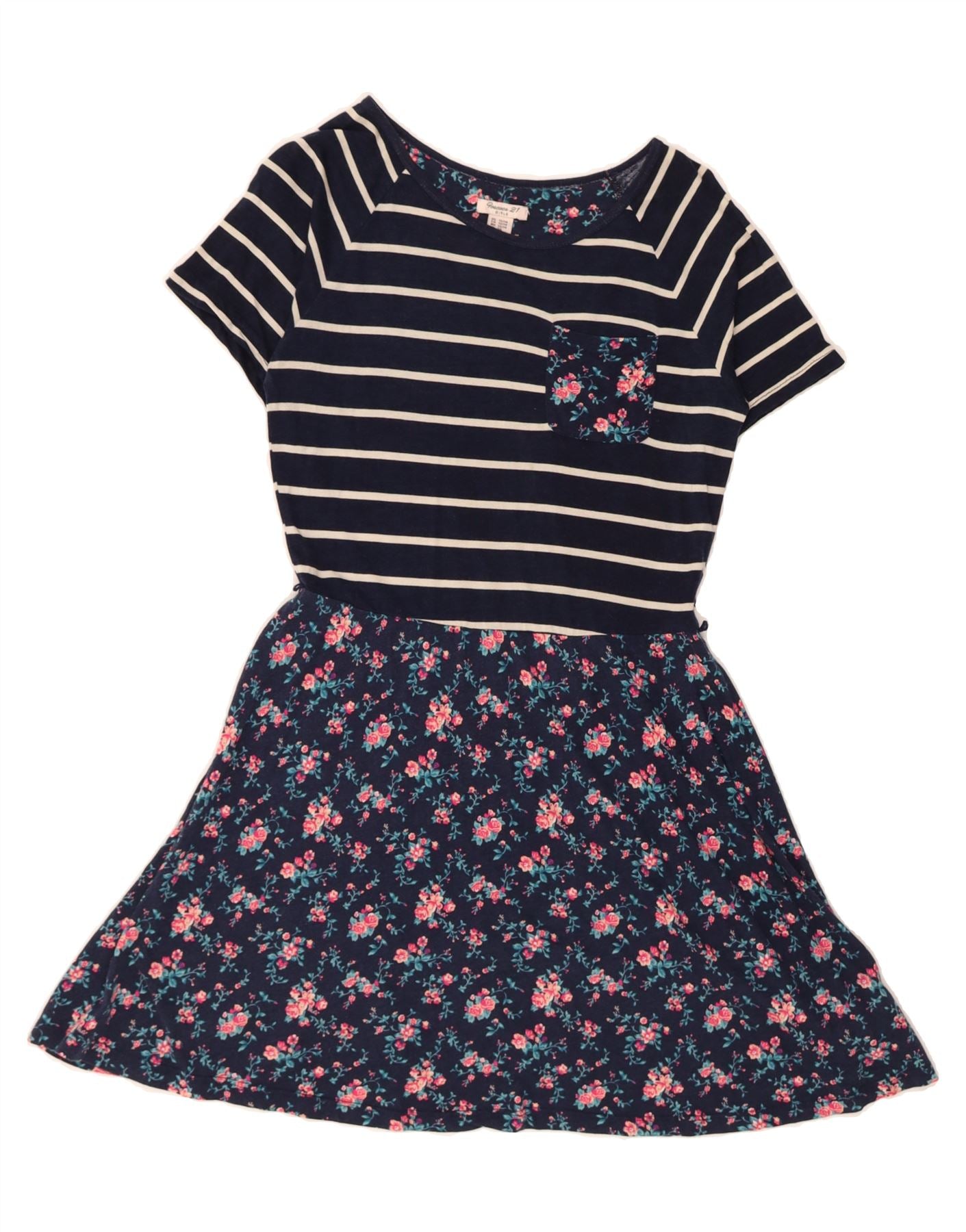 FOREVER 21 Girls A-Line Dress 13-14 Years Navy Blue Floral Cotton Nautical