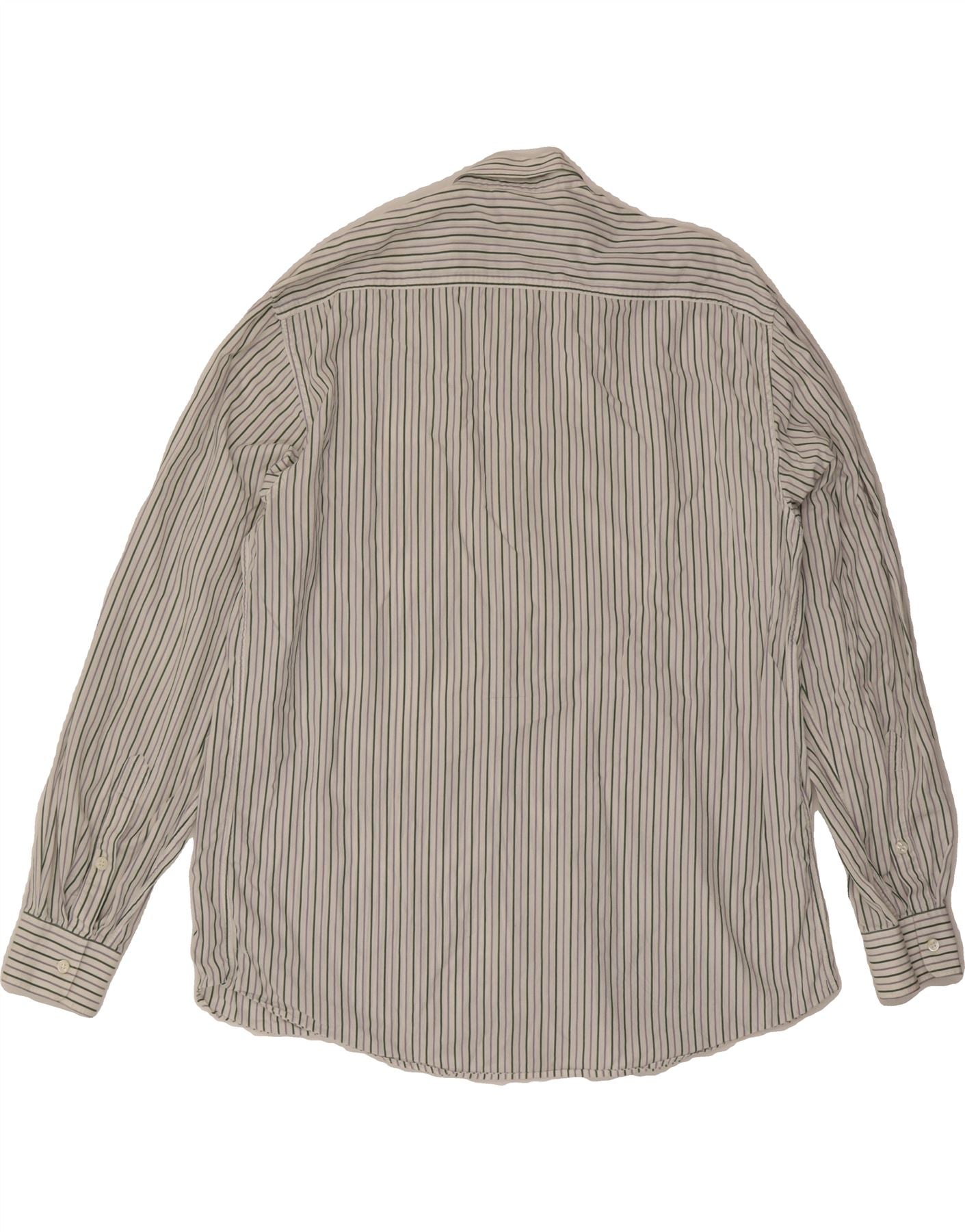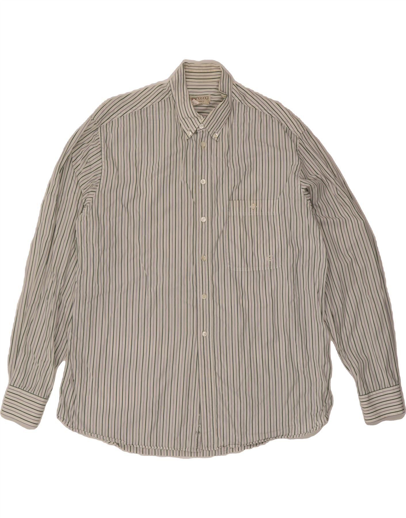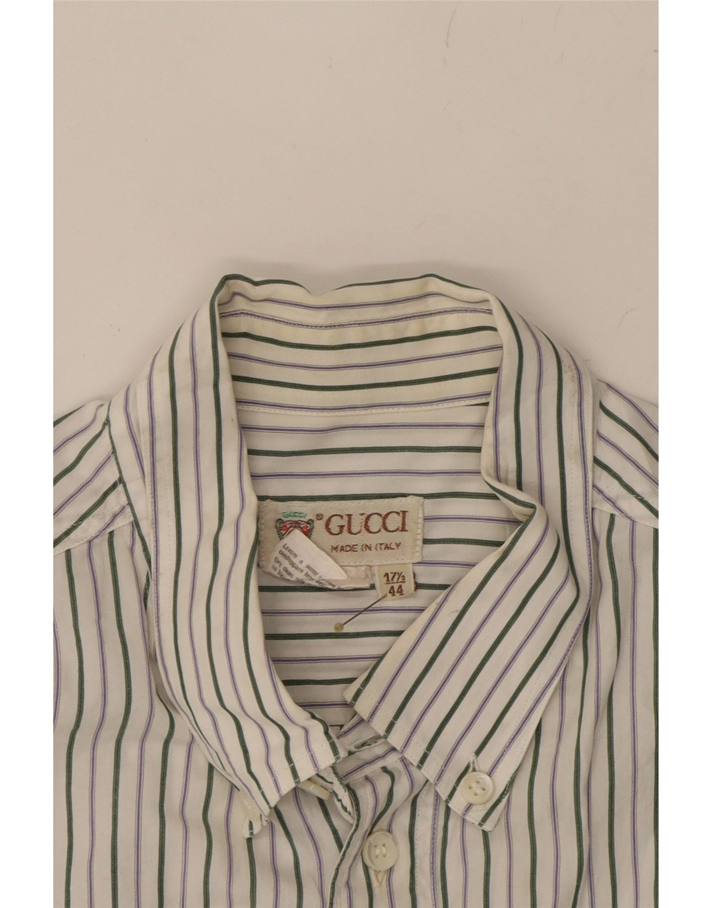 - AI Description: This pre-owned Gucci shirt, crafted in Italy, features a classic striped pattern on white woven cotton. The long-sleeved, button-down design includes a collared neckline and buttoned cuffs. Accented with buttons and subtle logo detailing, this regular fit shirt offers both style and comfort. The shirt also features practical pockets and a checked feature type. Labelled size 17 1/2, it's a timeless addition to any gentleman's wardrobe. Recommended price is £80.50.