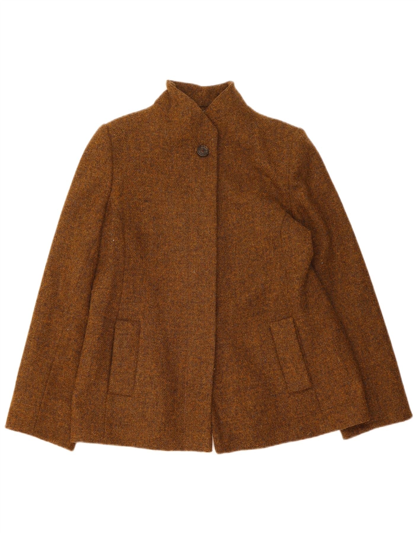 - AI Description: This House Of Bruar womens blazer jacket is crafted from luxurious 100 percent Pure New Wool tweed. The brown fabric features a sophisticated flecked pattern, adding depth and character. It boasts a classic collared neckline and long sleeves. A single button closure creates a refined silhouette. Practical pockets enhance its timeless design. The regular fit ensures comfortable wear, making it a versatile wardrobe staple.