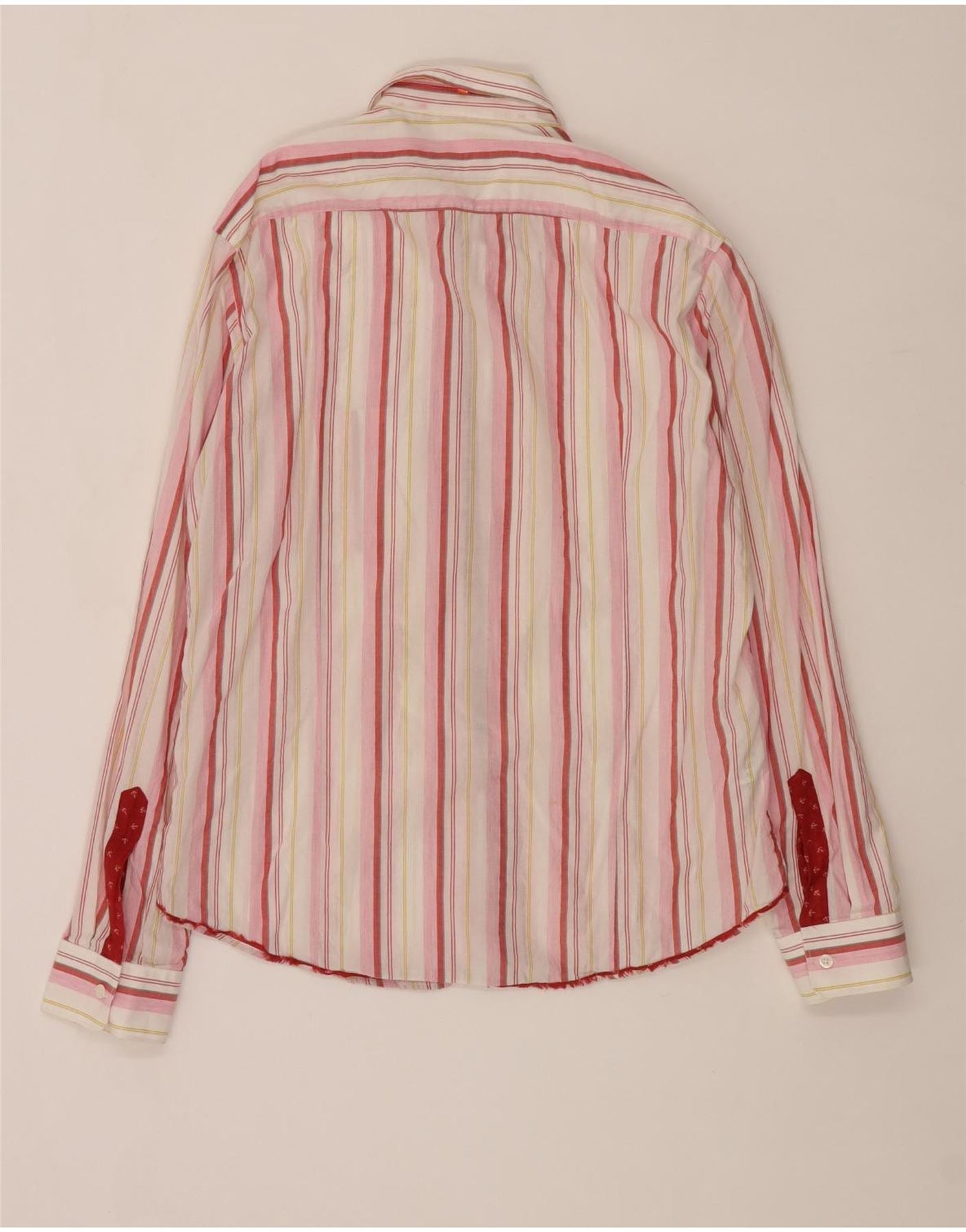 - Descripción de IA: Esta camisa para hombre Hugo Boss está confeccionada con un cómodo tejido de mezcla de algodón. Presenta un vibrante patrón de rayas multicolores en rojo, rosa y blanco. El escote con cuello y la parte delantera completa con botones ofrecen un estilo clásico e inteligente. Mangas largas terminadas con puños prolijos. Un ajuste regular garantiza un uso cómodo. Esta camisa incluye prácticos bolsillos, combinando estilo con funcionalidad.