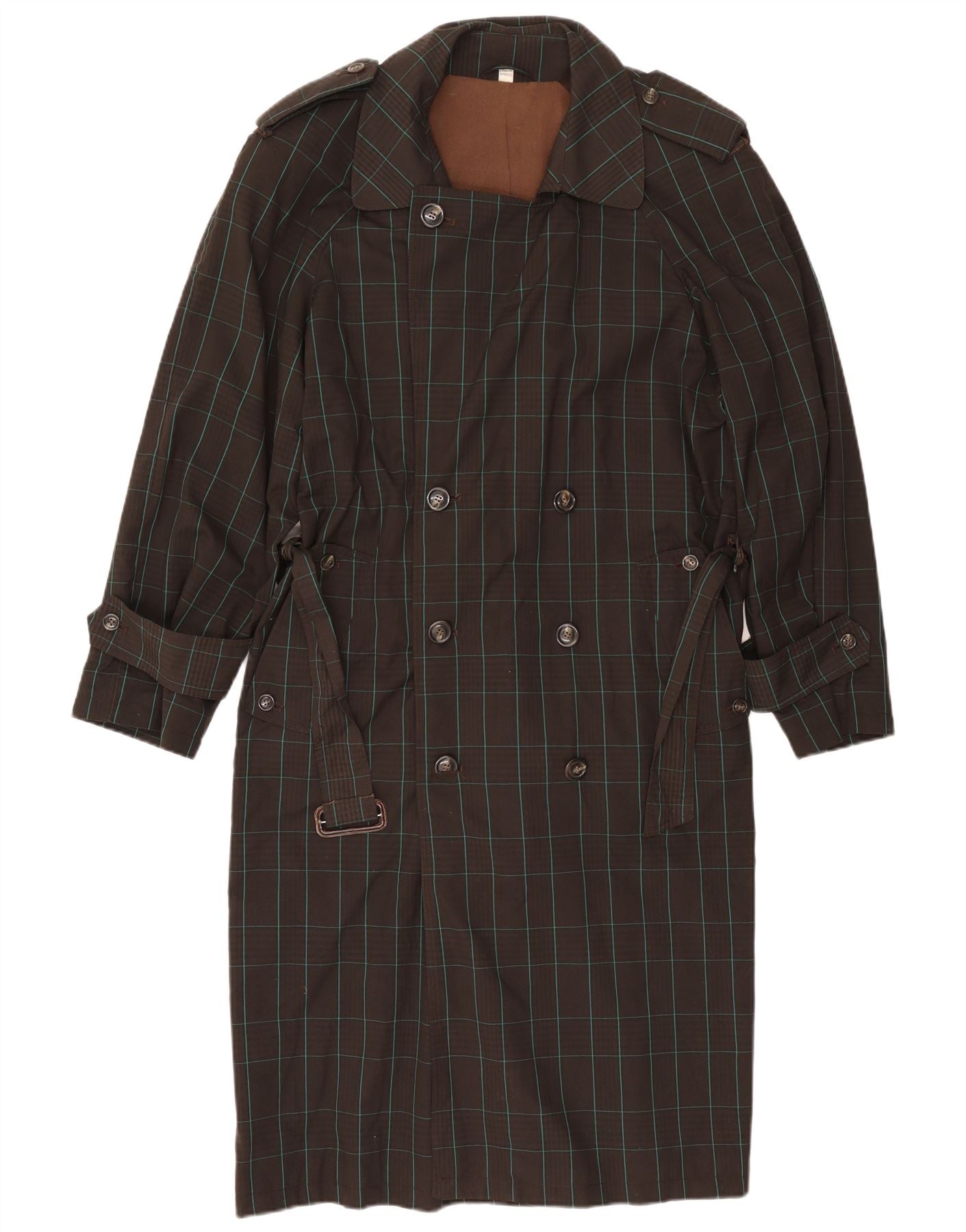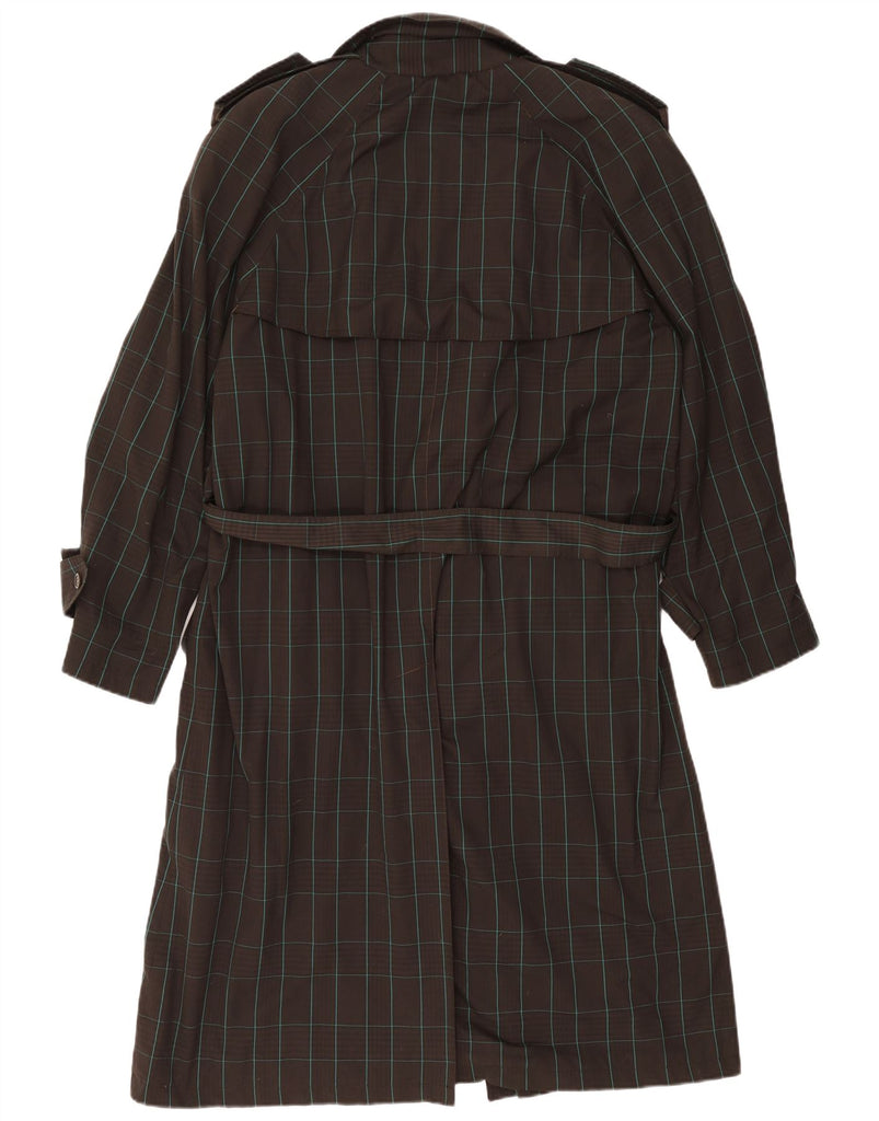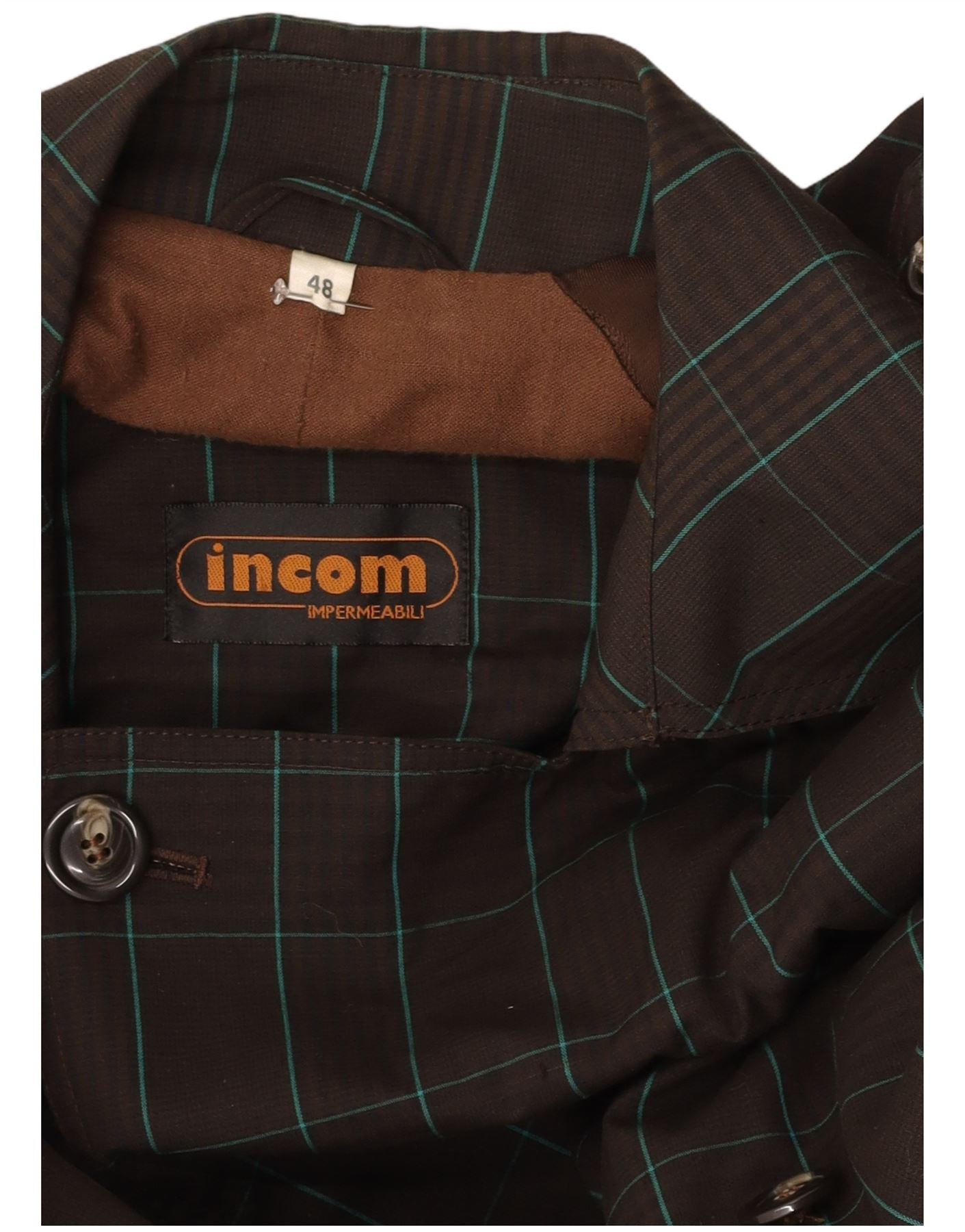 - AI Description: This Incom mens trench coat is crafted from a woven fabric in a classic brown check pattern. It features a collared neckline and a double-breasted button closure. Long sleeves and a regular fit ensure comfort. The belted waist offers a tailored silhouette. This water-resistant coat combines classic style with practical design, perfect for unpredictable weather.