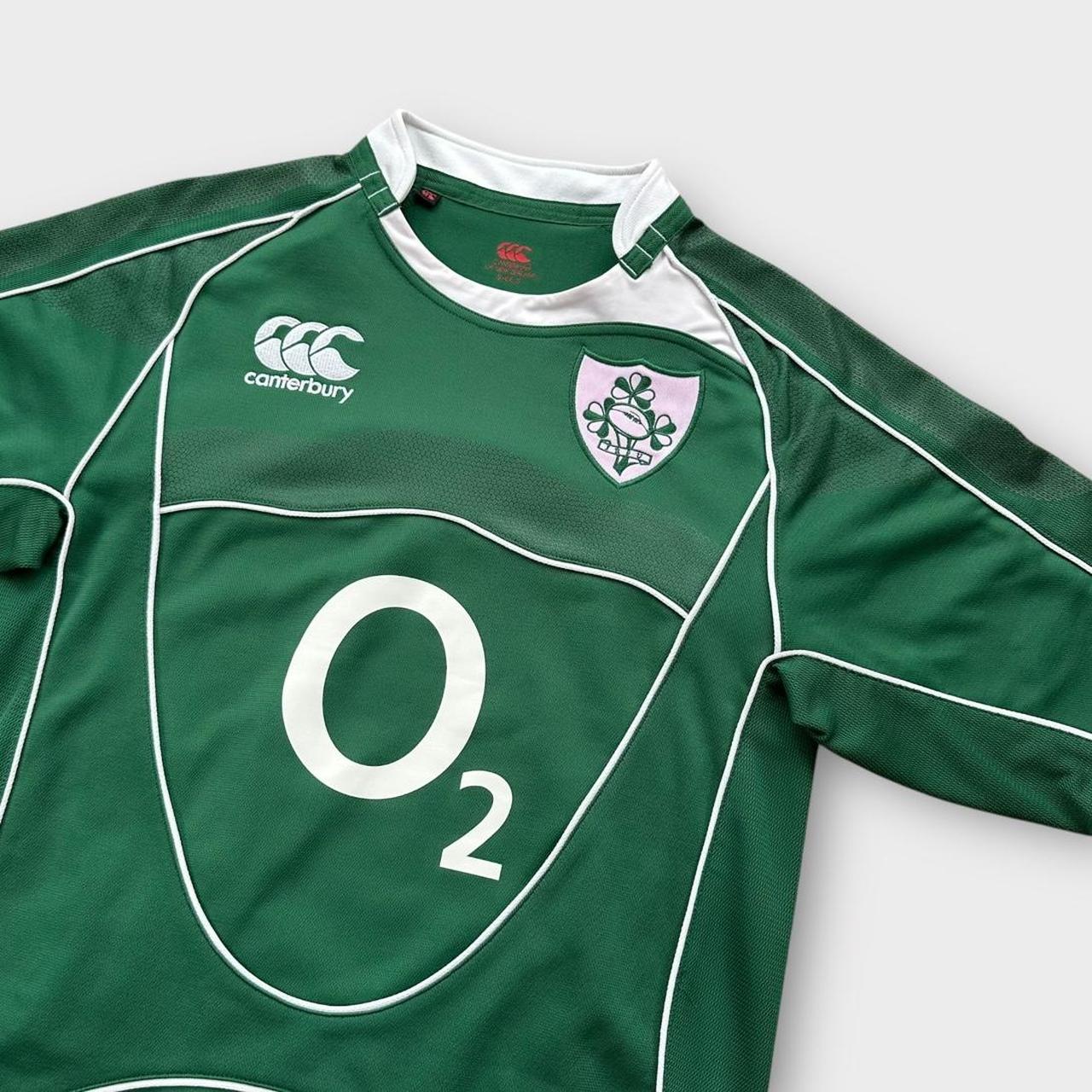 Camiseta de rugby de Irlanda de principios de 2000 de Canterbury con logotipos bordados y patrocinador en el pecho.