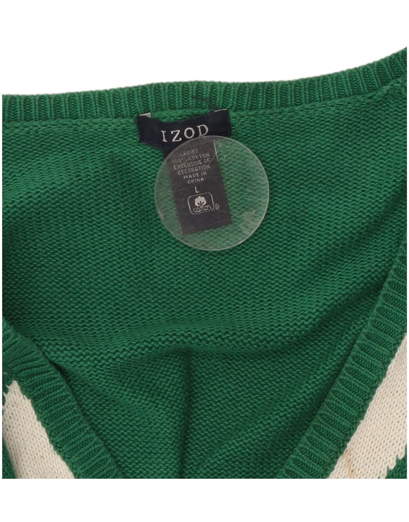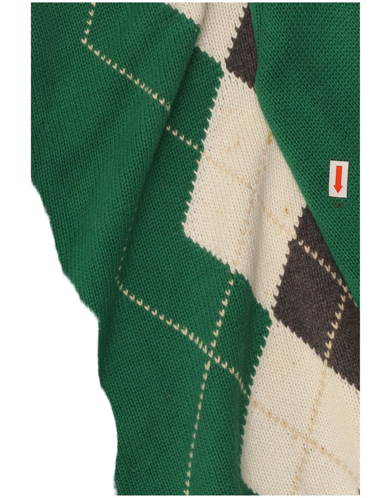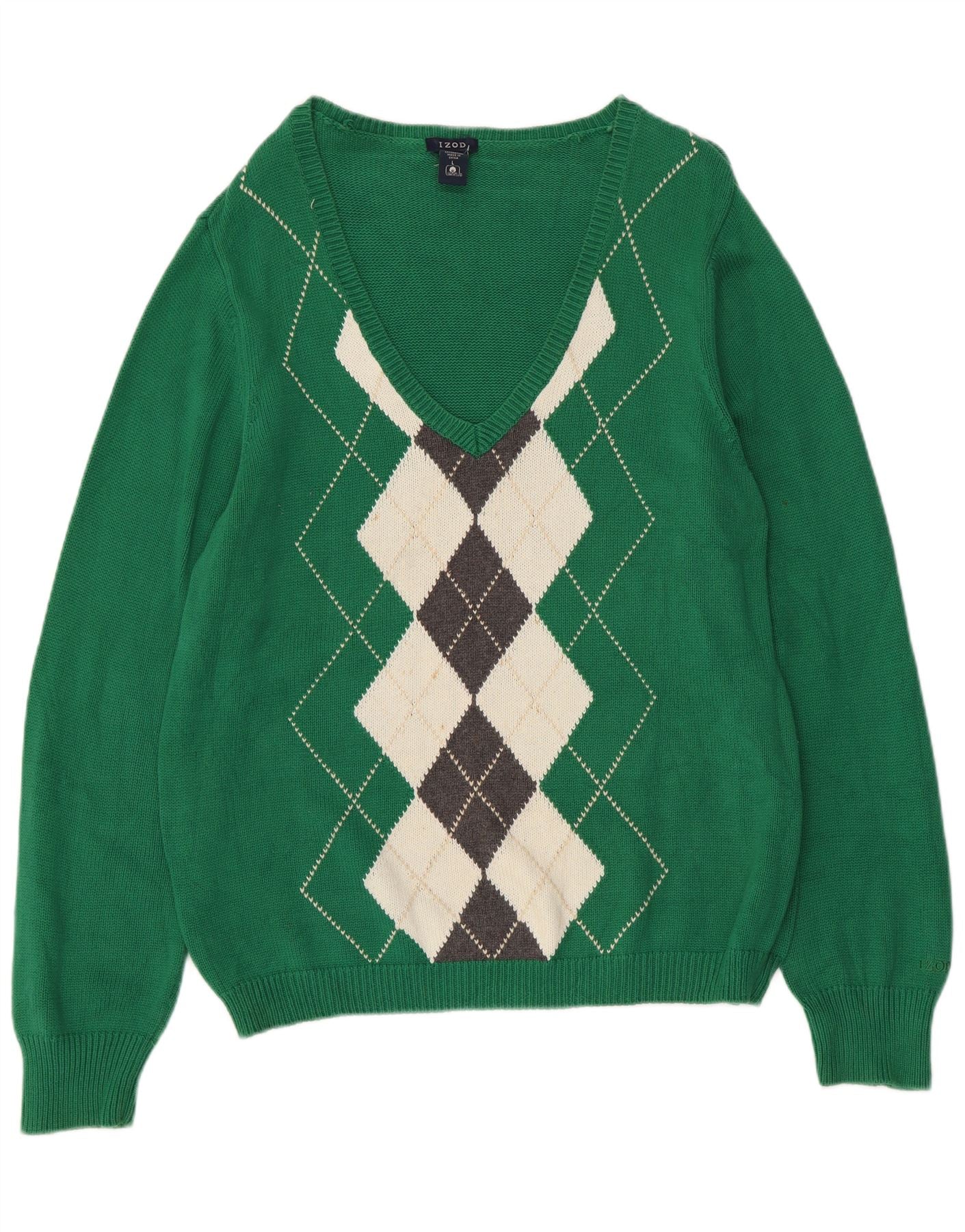 IZOD Womens V-Neck Jumper Sweater UK 16 Large Green Argyle/Diamond Cotton